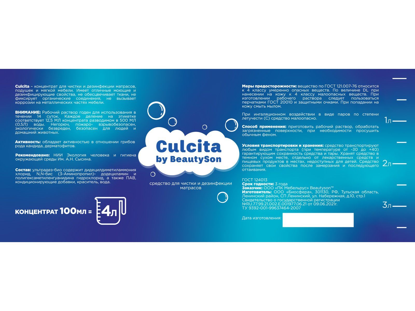 Чистящее средство Culcita by Beautyson – концентрат для чистки и дезинфекции матрасов, подушек и мягкой мебели. Имеет отличные моющие и дезинфицирующие свойства, не обесцвечивает ткани, не фиксирует органические соединения, не вызывает коррозии на металлических частях мебели.
