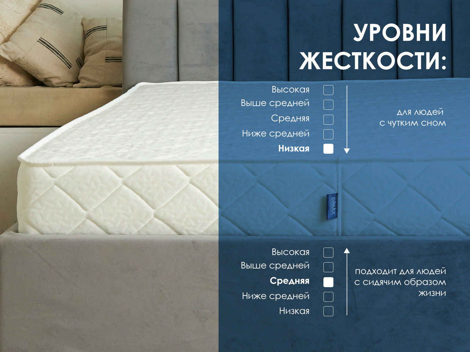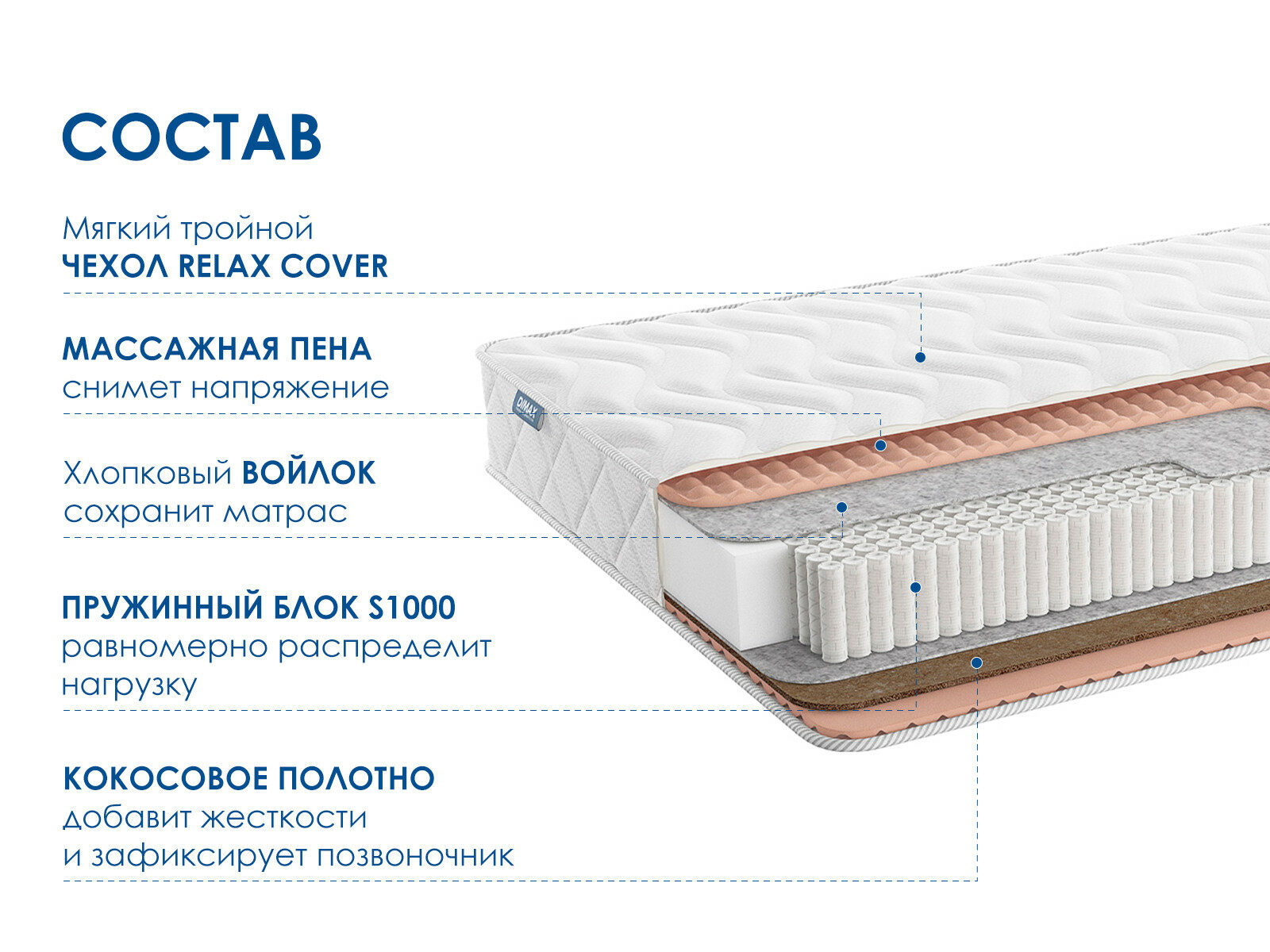 Массажный матрас Димакс Relmas Cocos 1 S1000 сочетает сразу два уровня жёсткости. Благодаря разностороннему наполнению и ортопедическим свойствам, модель подходит для комфортного отдыха и стоит на страже здоровья спины.