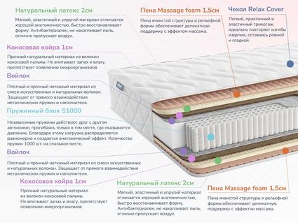 Двусторонний матрас Relmas Mix S1000 соответствует уровню жёсткости выше среднего. Модель дополнена массажной функцией – обе спальные поверхности изделия оказывают деликатное воздействие на тело.