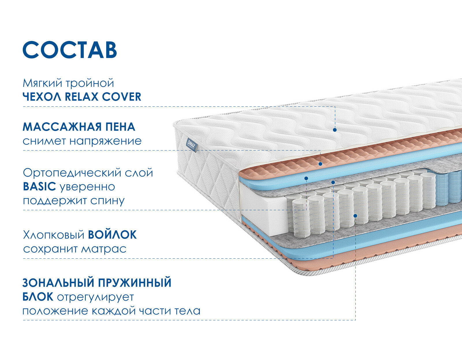Пружинный матрас Димакс Relmas Twin Foam 3Zone сочетает в себе комфорт, универсальность и массажный эффект. Модель с обеих сторон имеет среднюю жёсткость, что делает её подходящей для большинства пользователей.