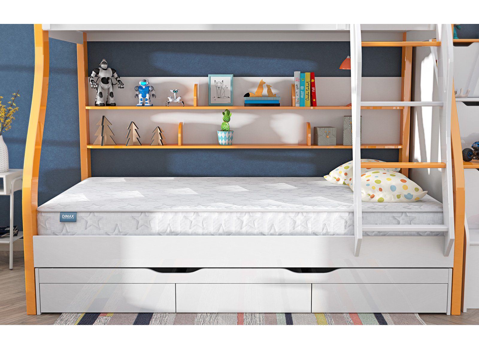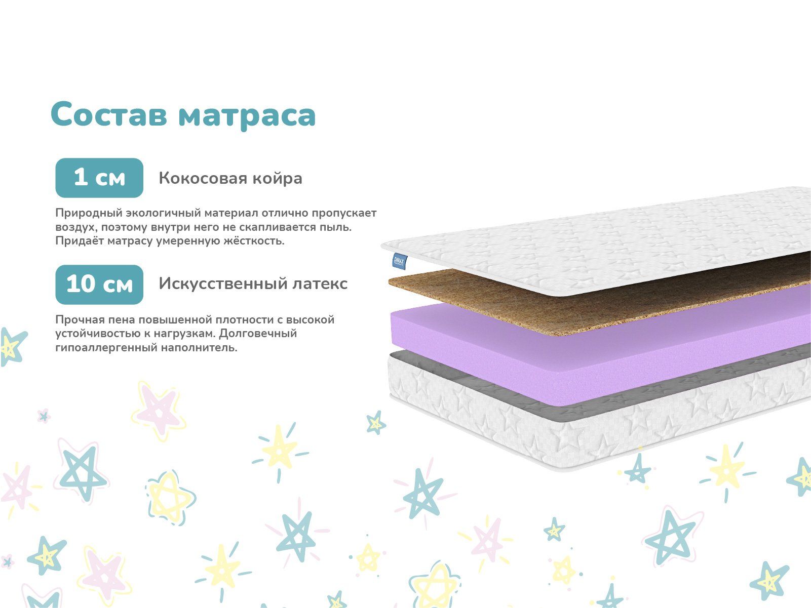 Димакс Космос – это беспружинный детский матрас со слоем кокосовой койры и двумя разными уровнями жёсткости. Такая универсальность помогает настраивать спальное место по мере взросления ребёнка и его меняющихся предпочтений. Гипоаллергенные настилочные слои и отсутствие пружин делают модель долговечной и устойчивой к активности детей.