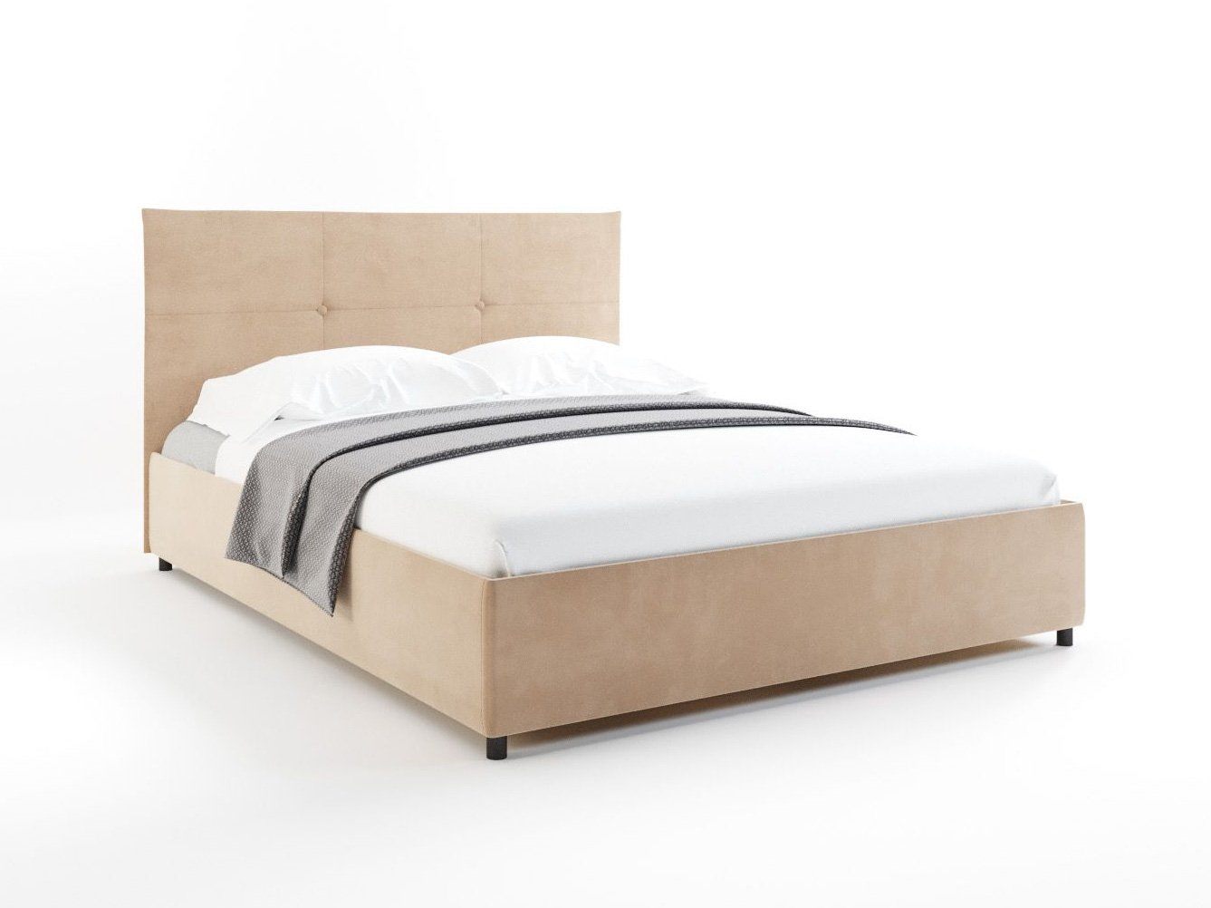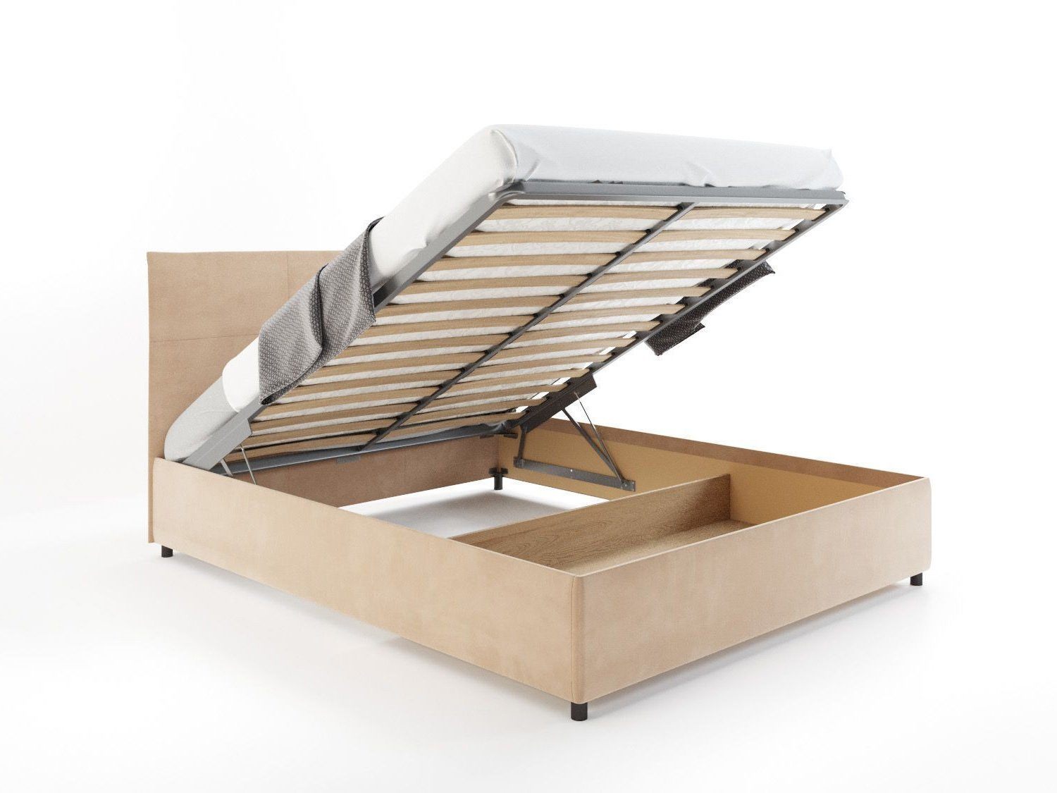 Каркас изголовья и царги кровати изготовлены из ДСП. Модель укомплектована подъемным механизмом с двумя газовыми амортизаторами. Опционально - кровать может быть укомплектована только металлическим основанием под матрас (без подъёмного механизма) или вовсе без основания и подъёмного механизма. Отсек для хранения постельных принадлежностей с вкладным полом на 1/2 кровати.