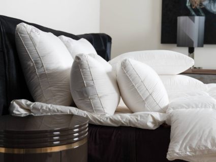 Немецкий хлопковый сатин высочайшей плотности соткан из тончайших нитей (Premium Satin – Nе 200/200 485 ТС) и прошел финишную обработку SanProCare® Sensitive, обеспечивающую усиленную гигроскопичность и придающую ей «пуховую мягкость». Особо тонкий, мягкий и «нешуршащий» чехол обладает повышенной износостойкостью и предотвращает проникновение пылевых клещей внутрь изделий. Наполнителем служит пух высочайшего качества, отобранный на гусиных фермах Сибири, которая, по утверждению биологов, является зоной проживания гусей, носящих пух максимально больших размеров, что, безусловно, влияет на пуховую массу положительно и наполнитель имеет повышенный коэффициент упругости (Fill Power), достигающий значений в 850 ед.