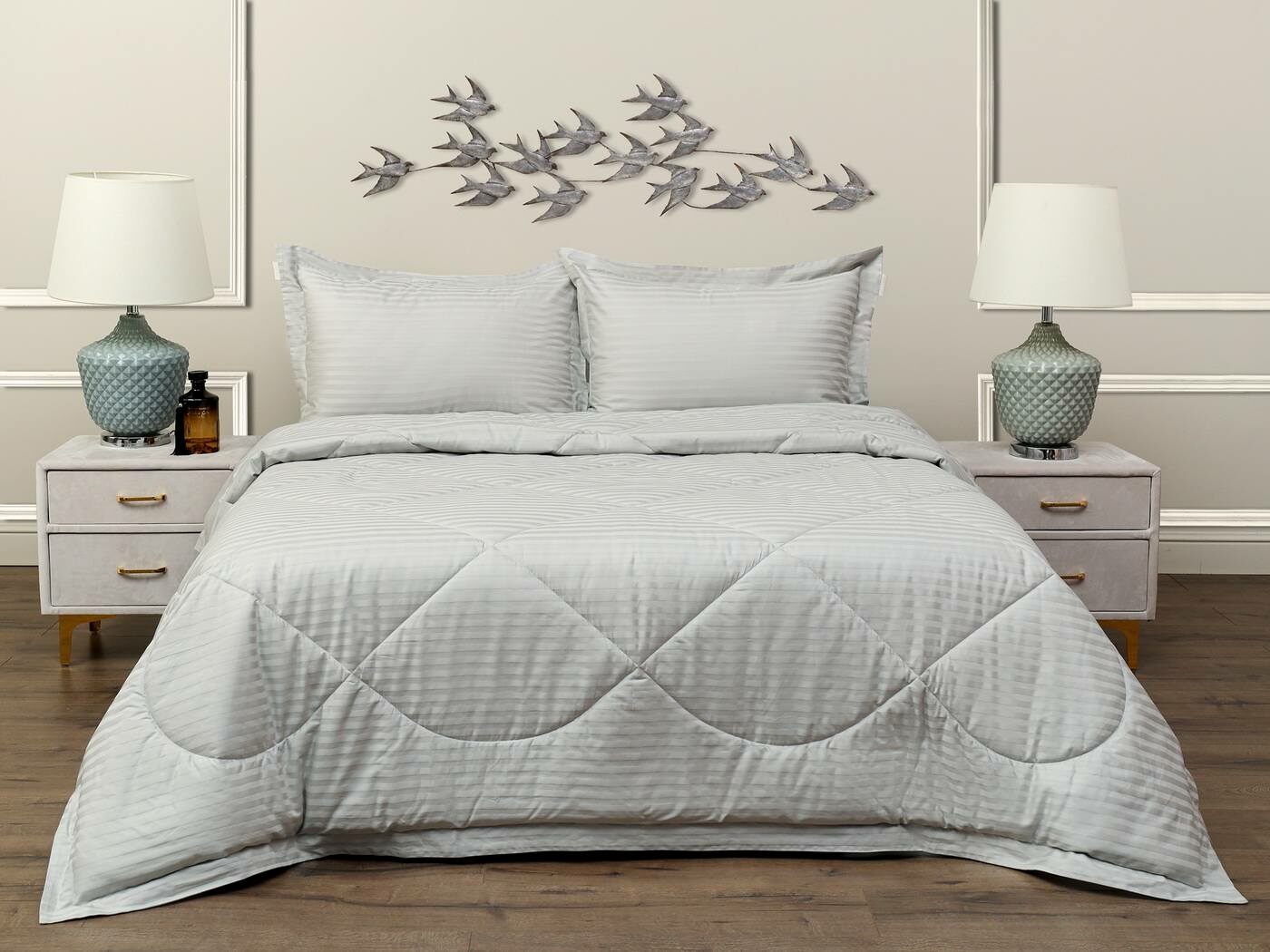 Одеяло очень удобно в использовании, легко стирается и быстро сохнет. Оно универсальное, средней толщины, что позволяет использовать его круглый год. К тому же, оно простегано элегантной стежкой, что не только придает красоты нашим комплектам, но и отлично фиксирует слой наполнителя внутри изделия.