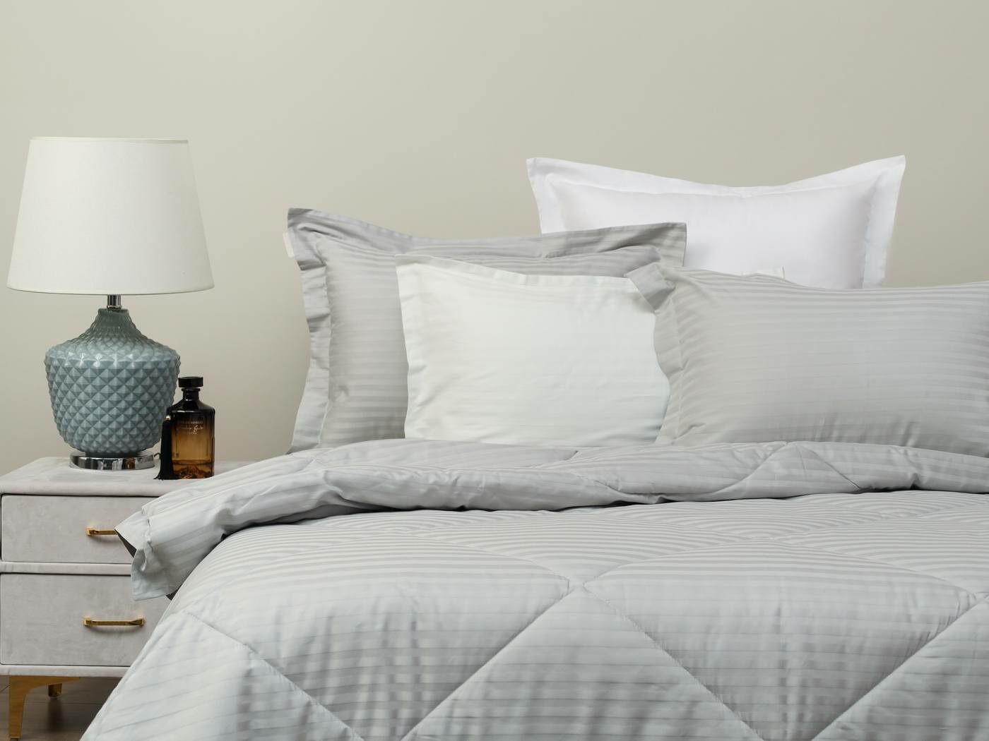 Это постельное белье с одеялом, которое не надо вставлять в пододеяльник. Комплект выполнен из качественной и натуральной хлопковой ткани. Эта ткань сочетает в себе мягкость и прочность, обеспечивая незабываемые ощущения во время сна. Жаккардовое плетение создает однотонный рисунок с элегантными чередующимися глянцевыми и матовыми полосками шириной 1 см, что привнесет вашему интерьеру изысканный вид. Такое плетение нитей придает долговечности ткани и потому используется в хороших отелях.
