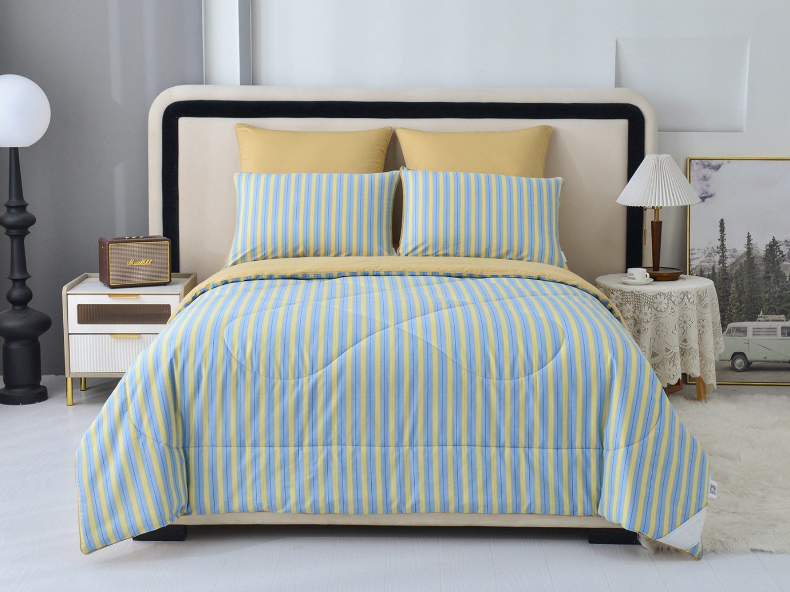 В комплект входит легкое, мягкое, летнее одеяло. Его можно стирать вместе с другим бельем, оно быстро сохнет и после стирки его не нужно гладить.