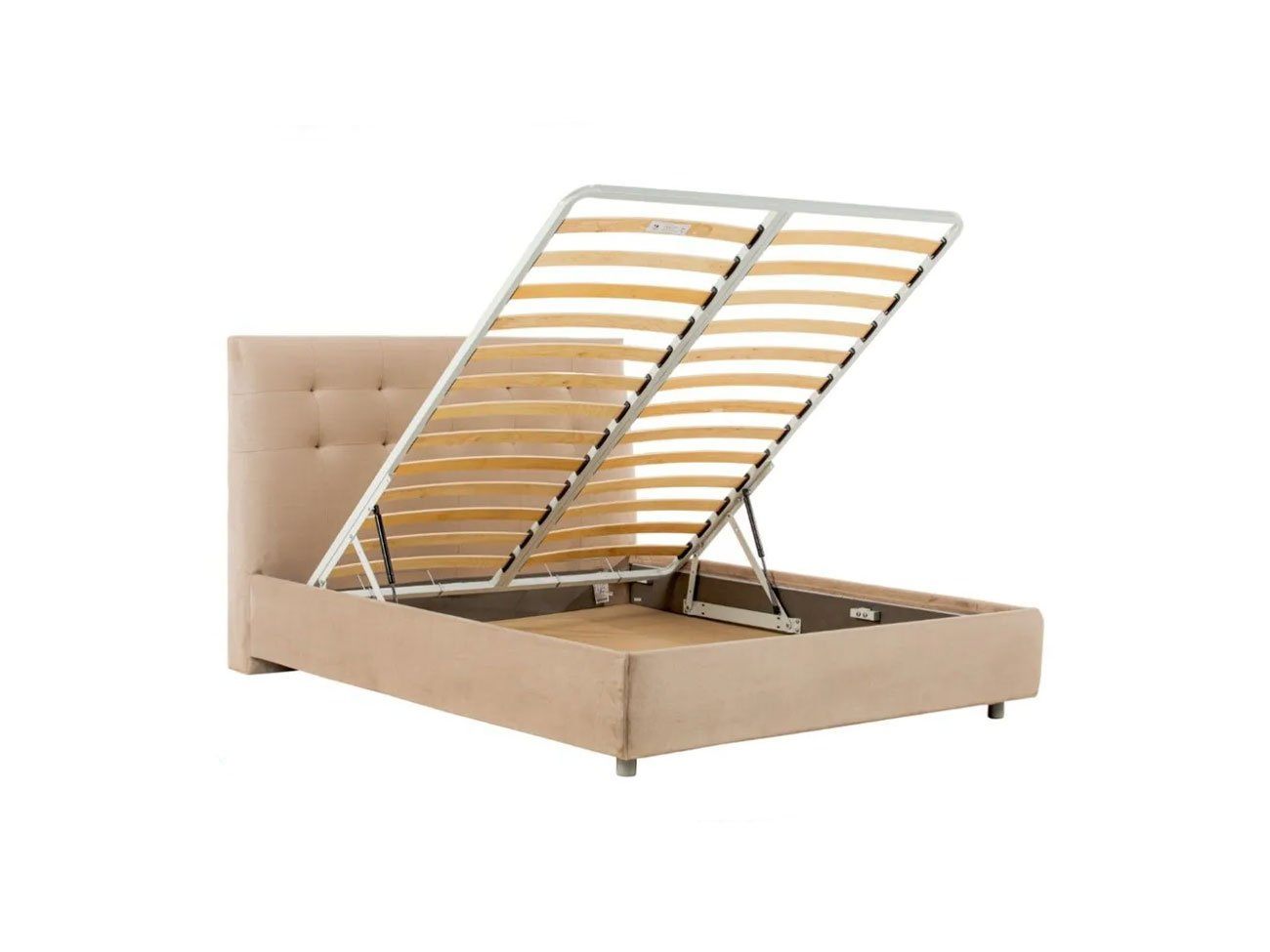 Кровать оснащена основанием с ламелями и подъемным механизмом. Рекомендуемая высота матраса до 30 см, вес матраса до 50 кг.