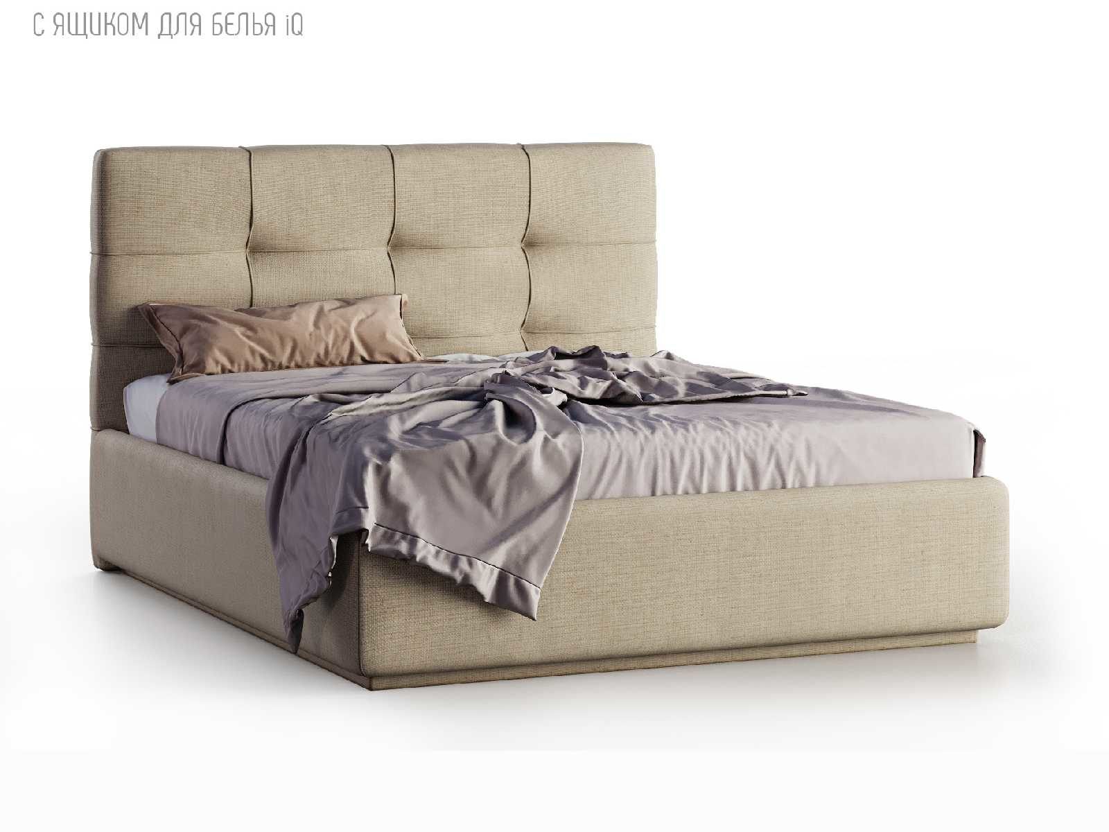Кровать укомплектована IQ с подъемным механизмом и ящиком для белья без дна (дополнительная платная опция - дно к ящику IQ из HDF (ХДФ). Каркас кровати на цоколе, декоративный чехол на цоколе съёмный. Глубина ящика для белья - 30 см, без ограничения нагрузки на ящик.