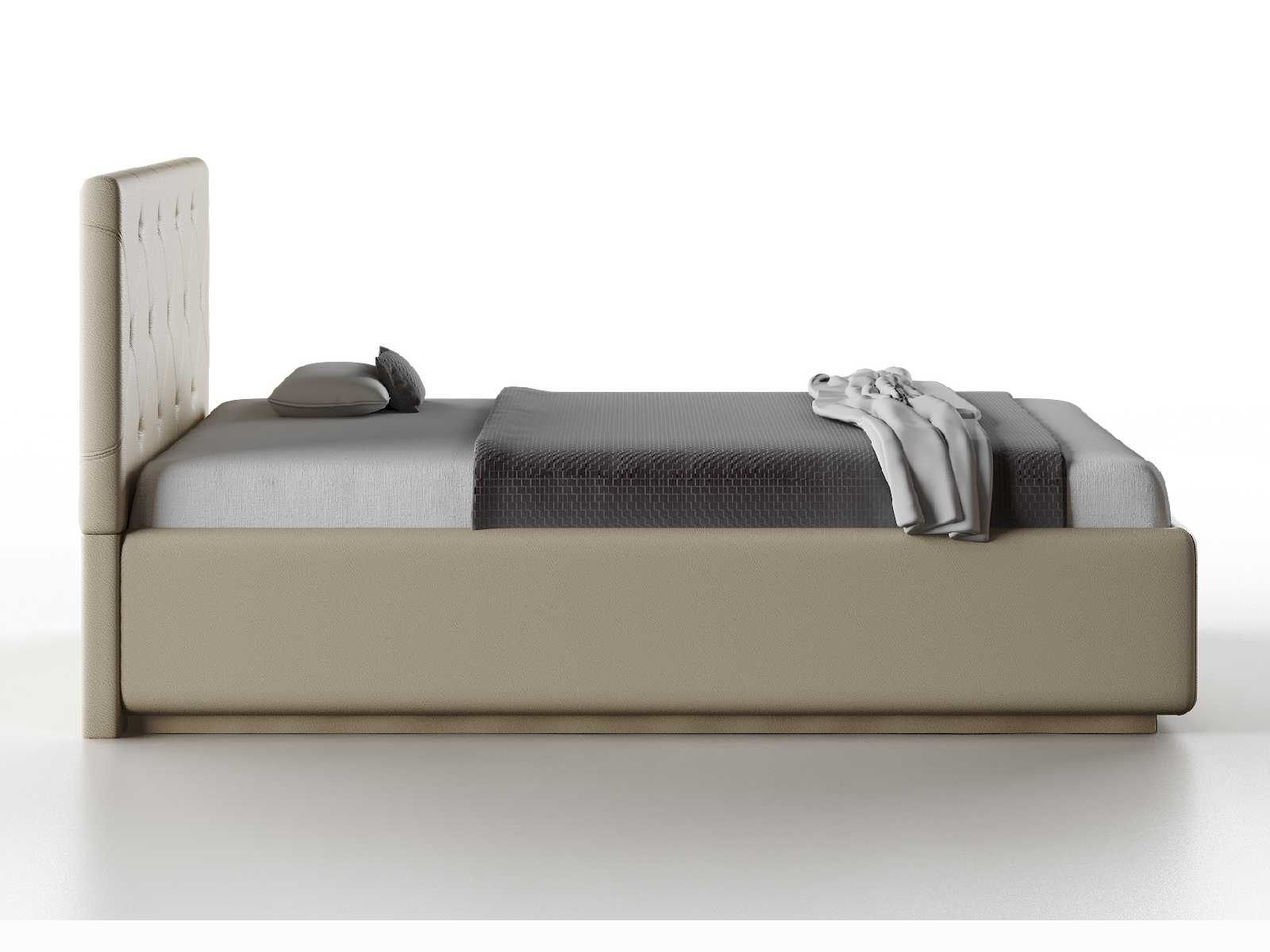 Кровать укомплектована IQ с подъемным механизмом и ящиком для белья без дна (дополнительная платная опция - дно к ящику IQ из HDF (ХДФ). Каркас кровати на цоколе, декоративный чехол на цоколе съёмный. Глубина ящика для белья - 30 см, без ограничения нагрузки на ящик.