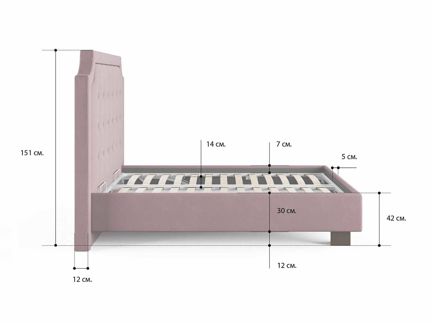 Кровать прекрасно впишется в интерьер от классики до современного стиля и cтанет отличным решением для просторной светлой спальни. Высокая спинка с мягкими утяжками и массивной рамкой выглядит эффектно. Задняя часть спинки кровати выполнена в основной ткани, благодаря этому ее можно установить в центре комнаты. Увеличенная прочность кровати достигается за счет металлического каркаса по периметру. Массивные ножки, выполнены из бука цвета венге. Расстояние от пола до царг способствует легкой уборке под кроватью, в том числе роботом – пылесосом.
