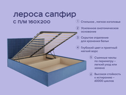 Кровать Лероса Сапфир мгновенно притягивает взгляды. Её изголовье украшает вертикальная параллельная стёжка. Стильная модель отличается продуманным дизайном и практично впишется в любой современный интерьер. Нежная велюровая обивка подарит самые мягкие и приятные соприкосновения. Модель оснащена подъёмным механизмом, что позволяет удобно хранить постельные принадлежности и любые другие вещи под основанием.