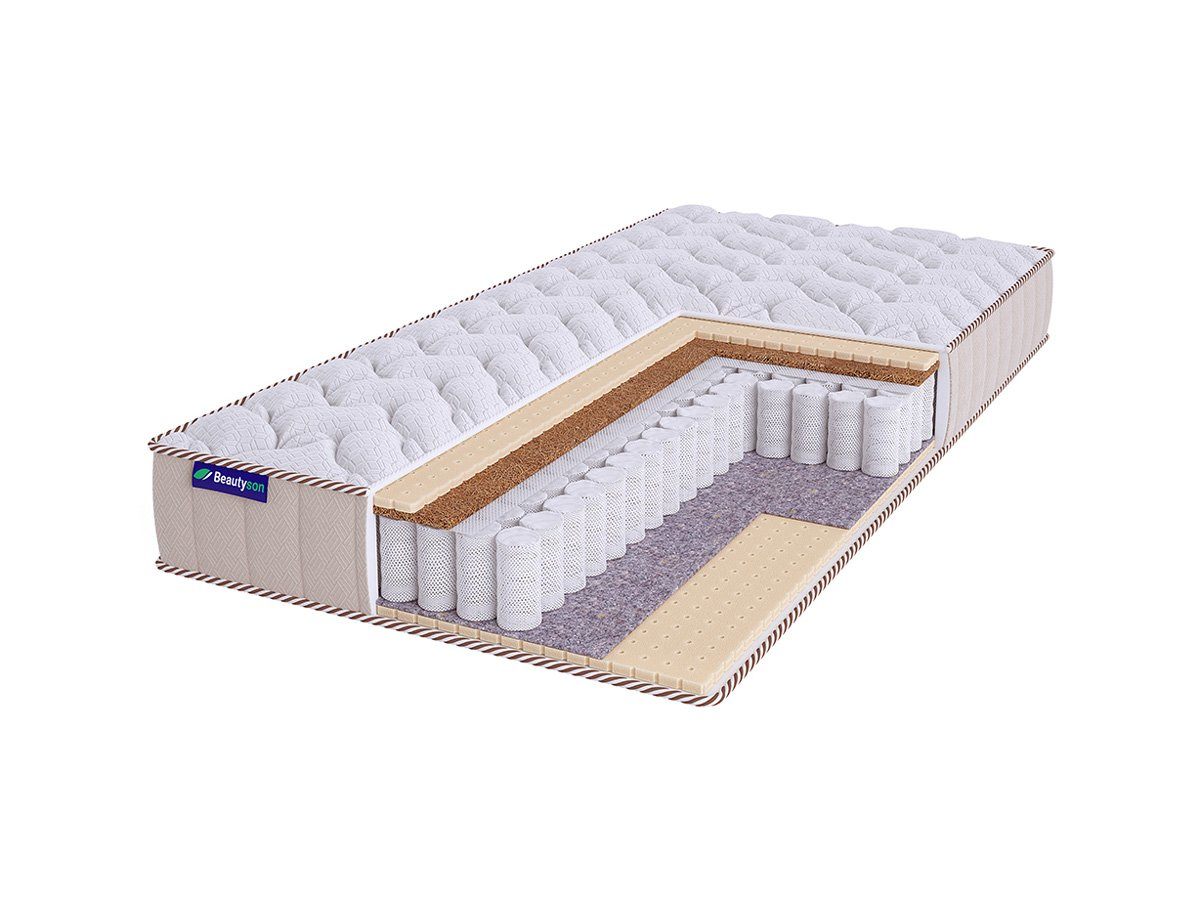 Наполнители – кокосовая койра и натуральный латекс. Кокос отвечает за правильную поддержку. Он гарантируют, что тело и спина спящего получат правильную опору на протяжение всего отдыха. Натуральный латекс даёт комфортную адаптивность и подстройку под анатомию человека.