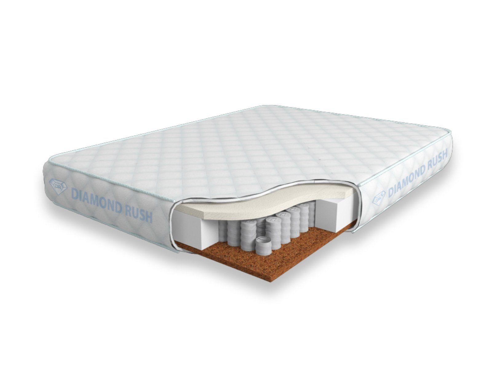 Матрас Diamond Rush Cocos-2 Contrast 725SD имеет в своей основе независимый пружинный блок 725, состоящий из пружин диаметром 5-6 см. В качестве настилочных слоев поверх пружинного блока используются износостойкий искусственный латекс с одной стороны и латексированная кокосовая койра с другой, поэтому матрас имеет две степени жесткости: среднюю и выше средней.
