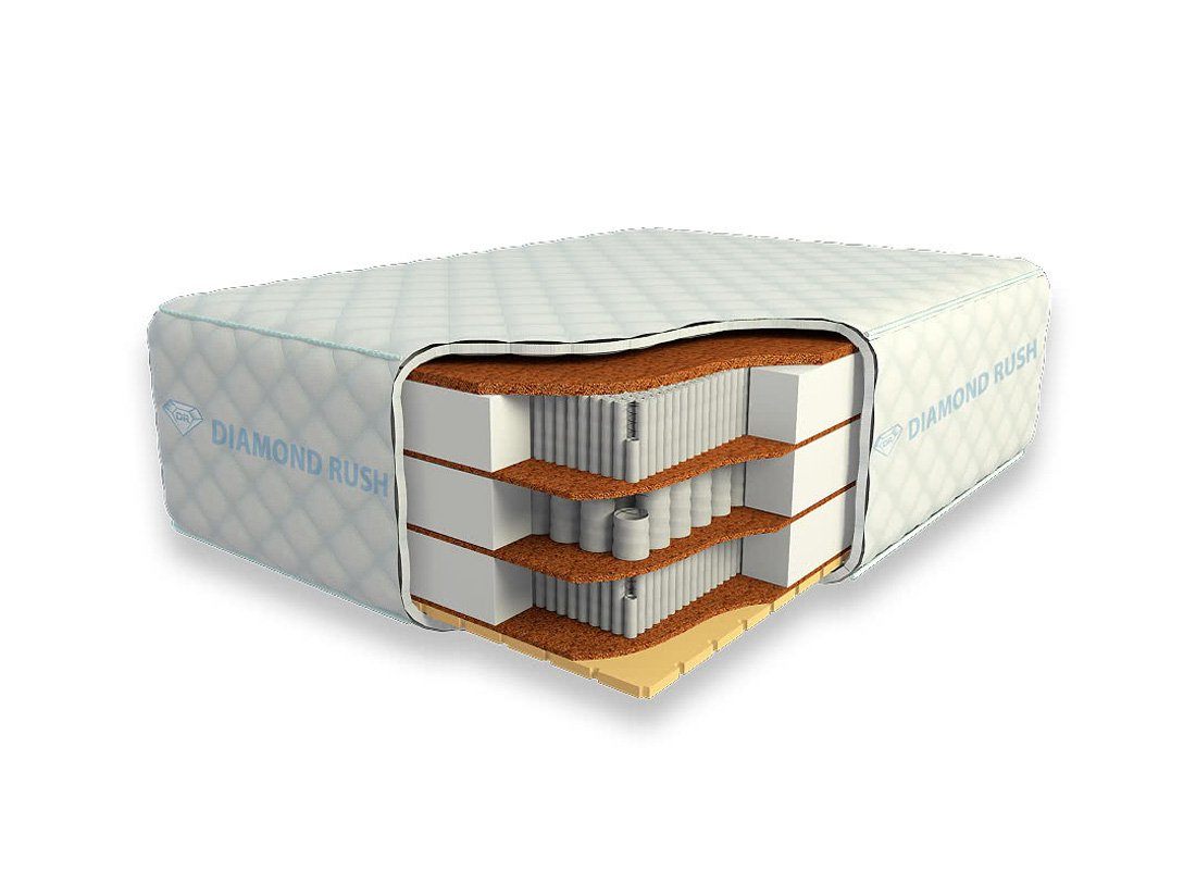 Для того чтобы пружины не воздействовали друг на друга и не портили специальные мешочки, в которые они помещены, между пружинными механизмами проложены слои латексированного кокосового волокна толщиной 1 см. Это натуральный, эластичный и долговечный наполнитель, который также используется в верхней части матраса для придания спальному месту высокой степени жесткости.