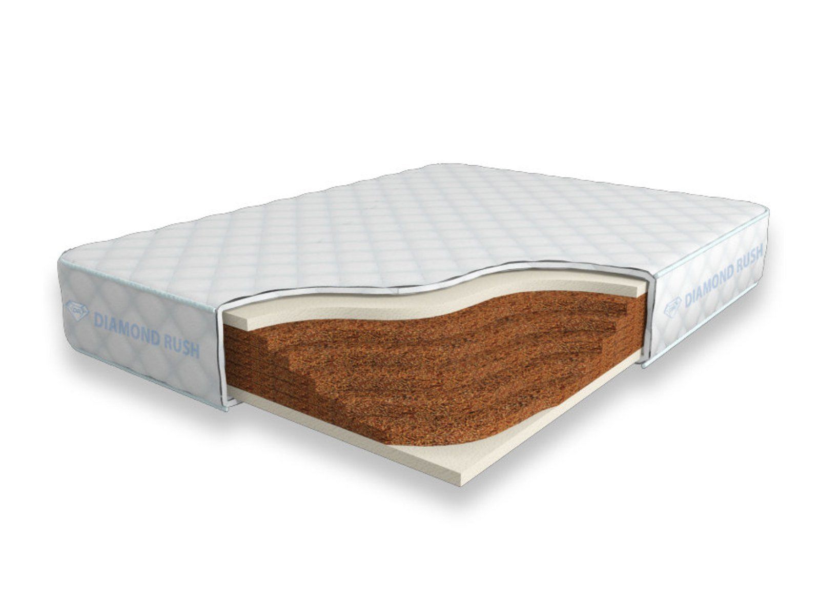 Матрас Diamond Rush Cocos Lite 21 SD не имеет в своей основе пружинного блока. В основе модели идут кокосовые плиты, их количество зависит от требуемой высоты матраса. Сверху и снизу для большего комфорта и придания средней жесткости прокладываются листы по 3см искусственного латекса. Эта модель имеет идентичные по жесткости стороны.