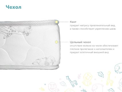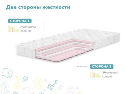 Детский беспружинный матрас Изюминка обладает классической средней жёсткостью сторон, а потому пользуется стабильной популярностью. Если вы избегаете слишком мягким моделей, чтобы ребёнок рос со здоровой осанкой, и в то же время вашему малышу не удобно спать на очень жёстких поверхностях, то этот матрас подойдёт в качестве оптимальной золотой середины.