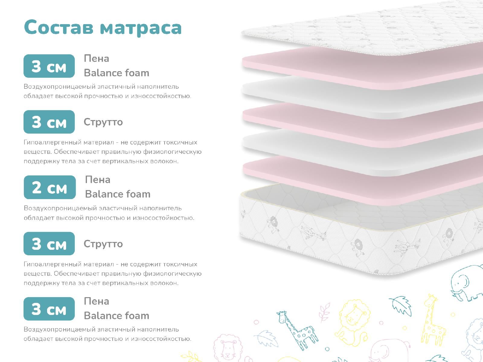 Изделие состоит из пяти слоёв, поочередно чередующихся между собой. Ортопедическая пена перемежается с материалом струтто. Эти наполнители имеют искусственное происхождение, а потому не вызывают аллергических реакций. Безопасность пены подтверждена европейским сертификатом, а струтто настолько хорош, что даже не боится огня. Материалы исключительно долговечны, не деформируются от постоянных монотонных нагрузок, не скапливают пыль и не удерживают влагу.