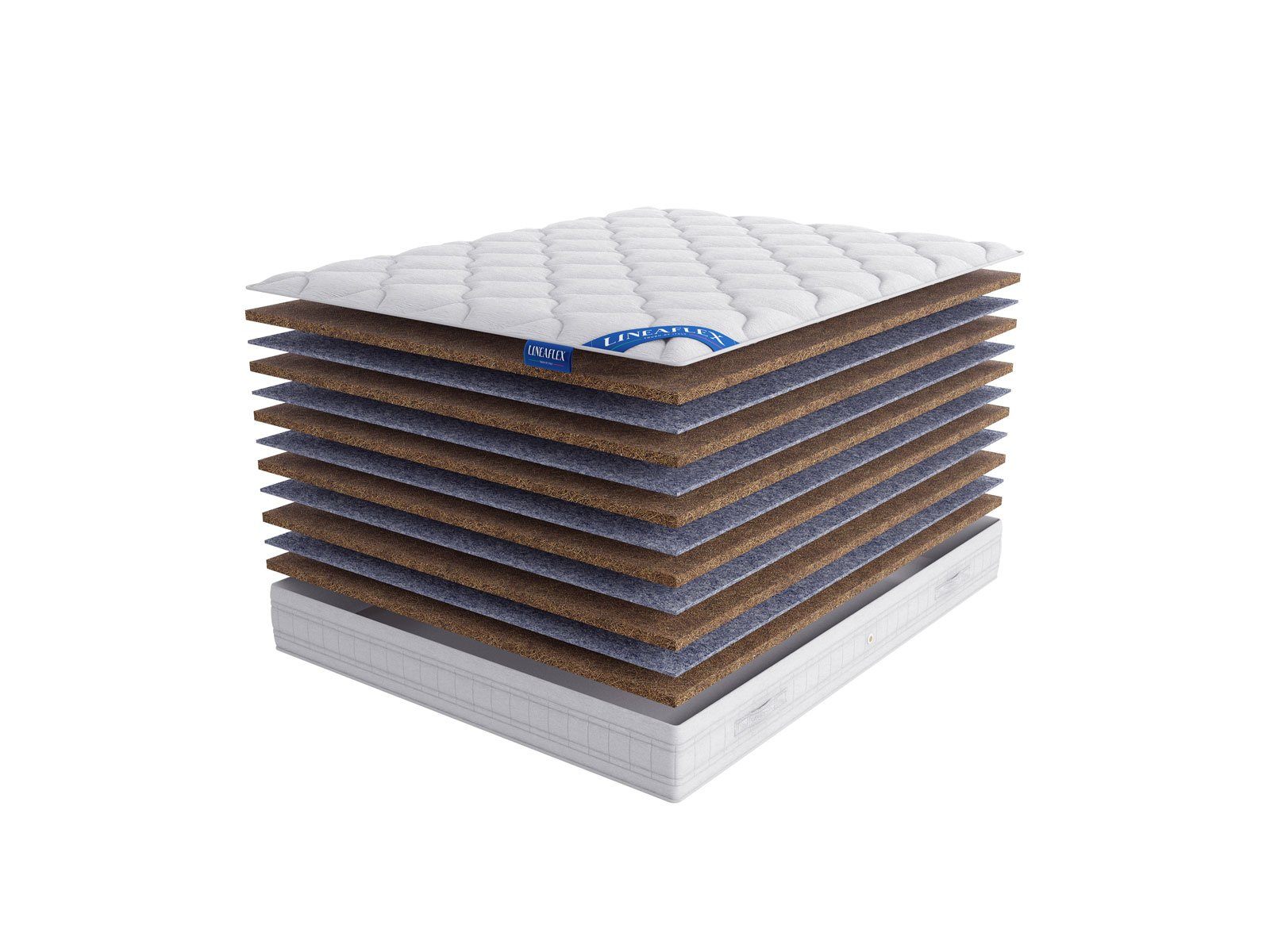 В своё распоряжение матрас получил один единственный наполнитель – латексированную койру кокоса. Изделие построено на 6 плитах материала по 3 см каждая. Слои разделяют полотна термовойлока, которые изолируют внутренние части изделия, не позволяя цепляться и тереться друг об друга. Это прямым образом сказывается на сроке службы спальной принадлежности.