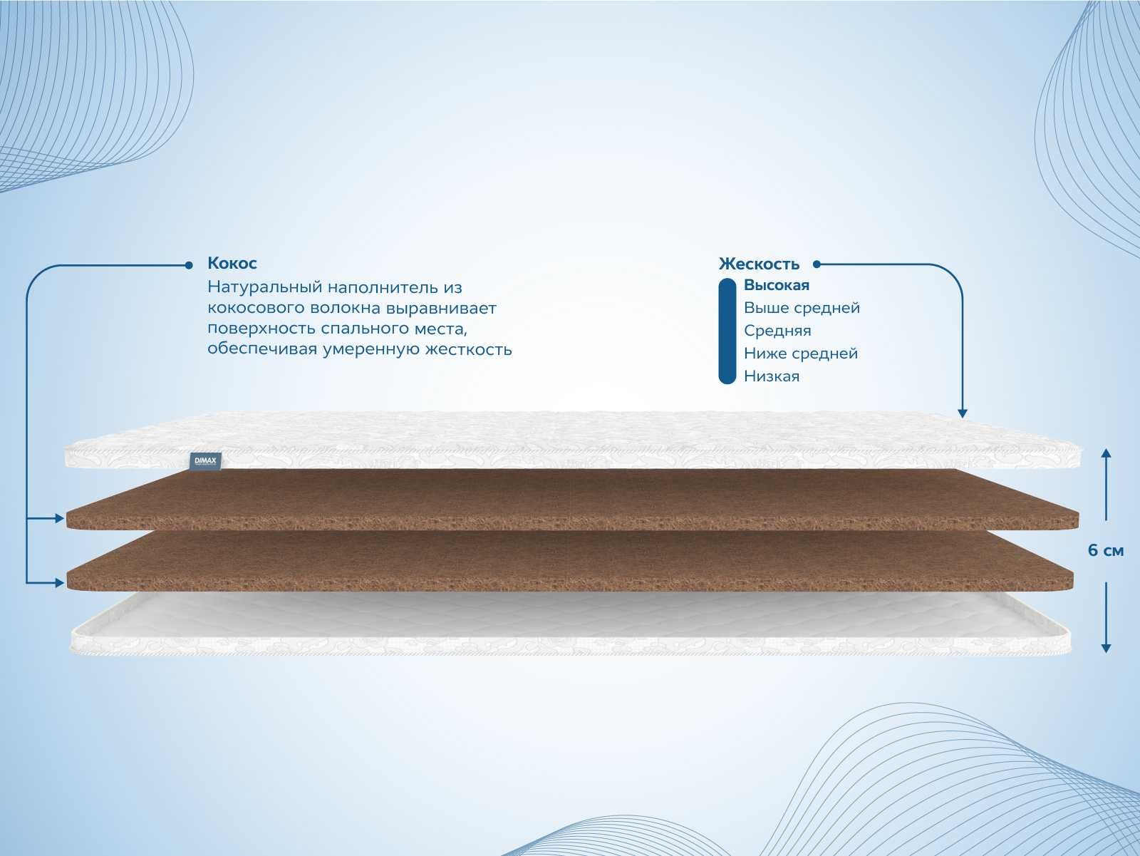 Ортопедический наматрасник Димакс Кокос 6 см — это топпер с высоким уровнем жёсткости, идеально подходящая для тех, кто предпочитает плотные и твёрдые спальные поверхности. Наматрасник легко устраняет излишнюю мягкость постели, сглаживает провалы и неровности старого или неправильно подобранного основного матраса, обеспечивая комфортный и ортопедически правильный сон.
