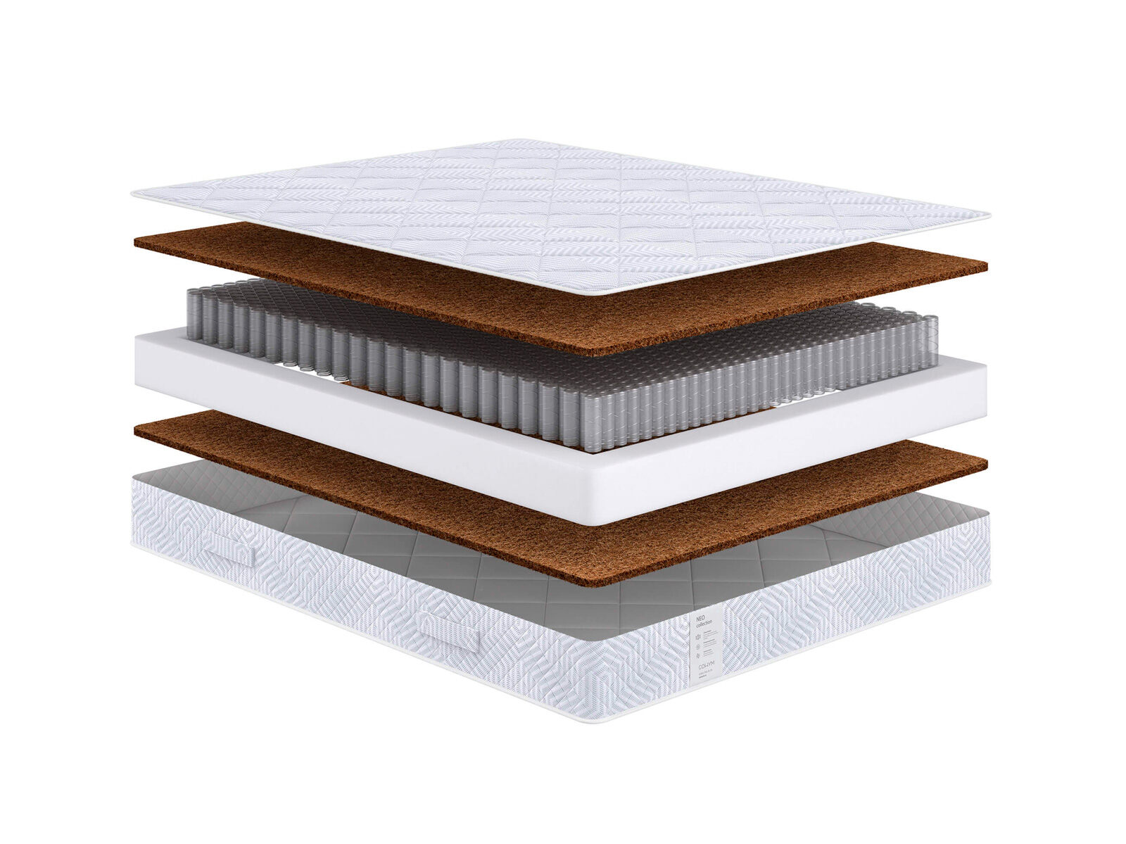 Жесткий двусторонний матрас с кокосовой койрой в составе. Она обладает воздухопроницаемостью, антибактериальными свойствами и поддерживает благоприятный микроклимат спального места. Независимый пружинный блок равномерно распределяет нагрузку и снимает напряжение с позвоночника.