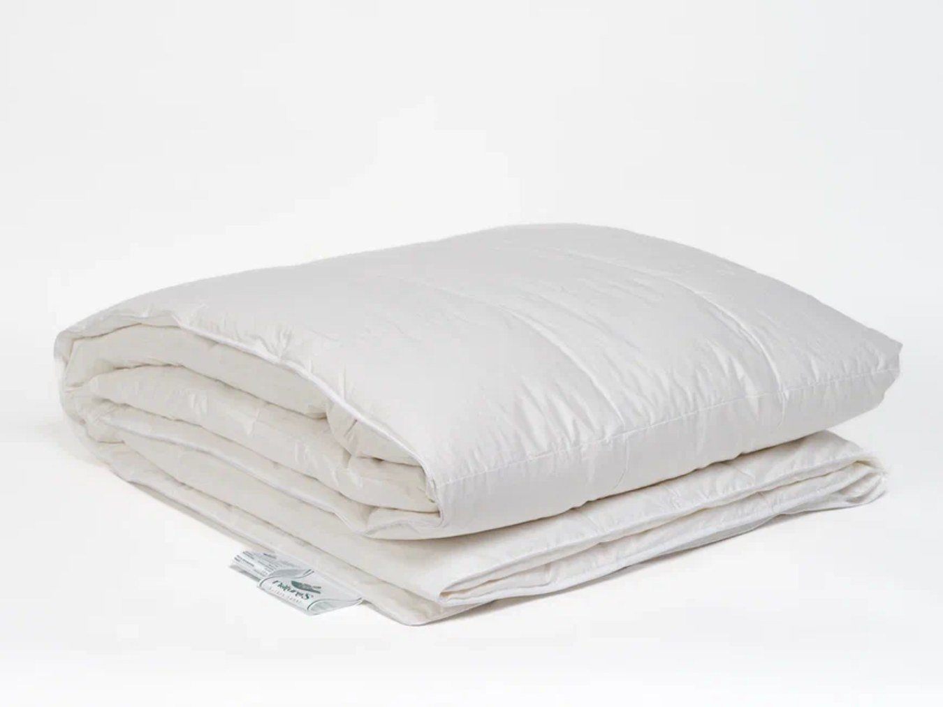 Всесезонное одеяло Воздушный Вальс с 100% пуховым наполнителем в снежно-белом чехле с атласным белым кантом. Ткань чехла - 100% хлопок – батист с антибактериальной обработкой "ACTIGARD".