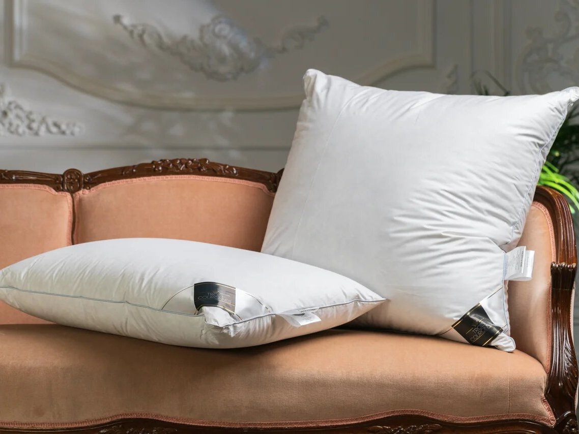 Классическая однокамерная подушка без бортика Royal Wild Duck Down Medium белого цвета, серебристая кайма.