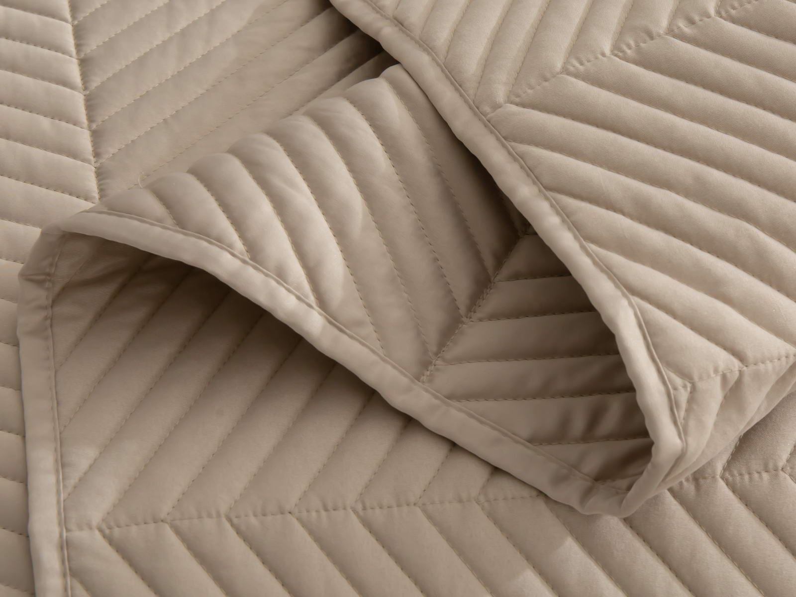 Стёганое дышащее покрывало Адонис на 70% состоит из хлопка и на 30% из вискозы. Ткань изделия гладкая и приятная на ощупь. Декоративный кант и ритмичный «елочный» рисунок, выступающий над поверхностью, придают покрывалу игривый утонченный вид.