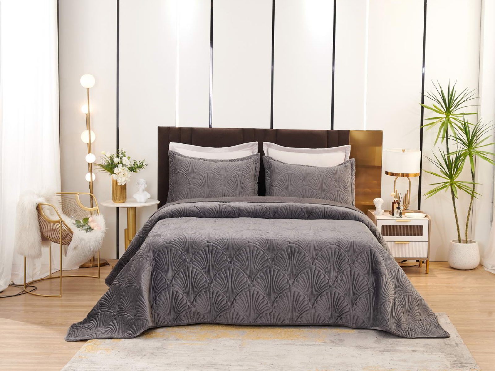 Роскошное велюровое покрывало Ариэль станет изюминкой любого интерьера, ведь оно потрясающе выглядит и приятное на ощупь. Обратите внимание на стежку покрывала – она выполнена в виде ракушек с эффектом 3D. Из-за особого плетения, велюровая ткань покрывала отражает свет и красиво переливается при различном освещении.