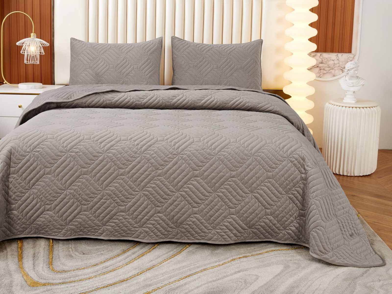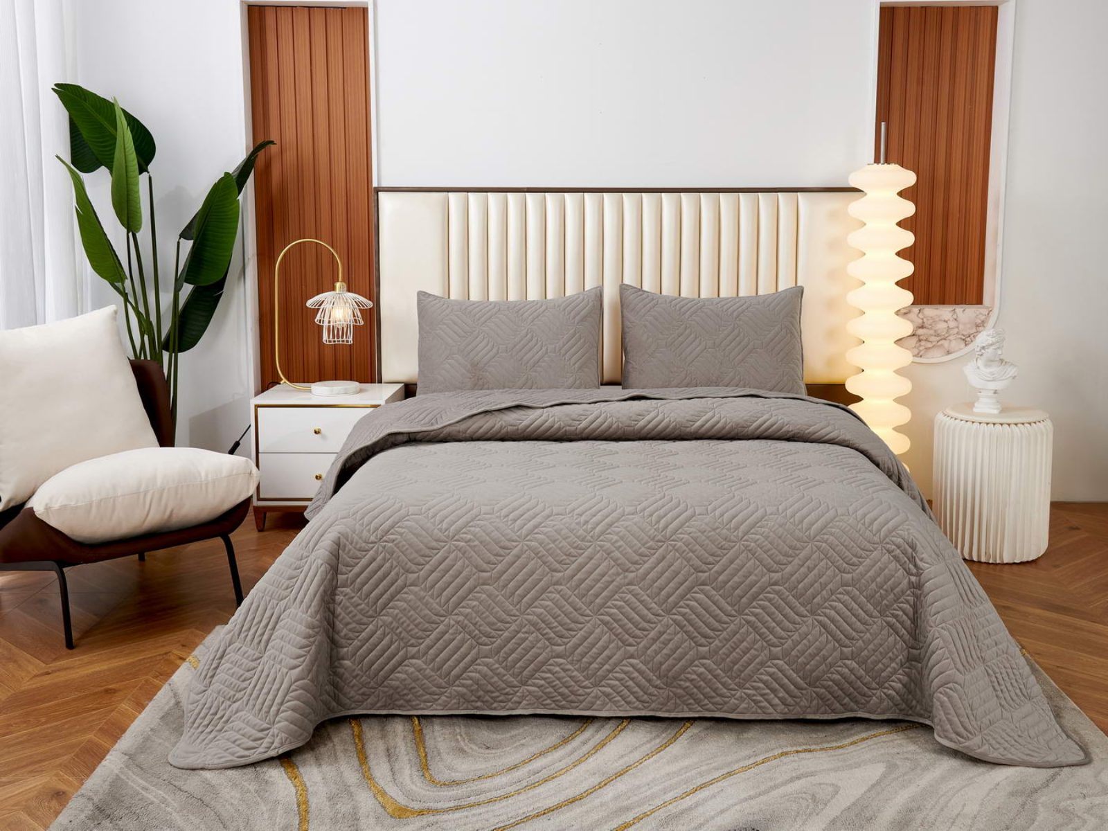 В комплект входят покрывало и одна либо две наволочки (50х70 см) из аналогичного материала в зависимости от размера. Каждый набор заботливо упакован в фирменную подарочную сумку.Покрывало стеганое с графическим узором. Пошив покрывала с кантом, наволочки на запахе, декорированы ушками 5 см.