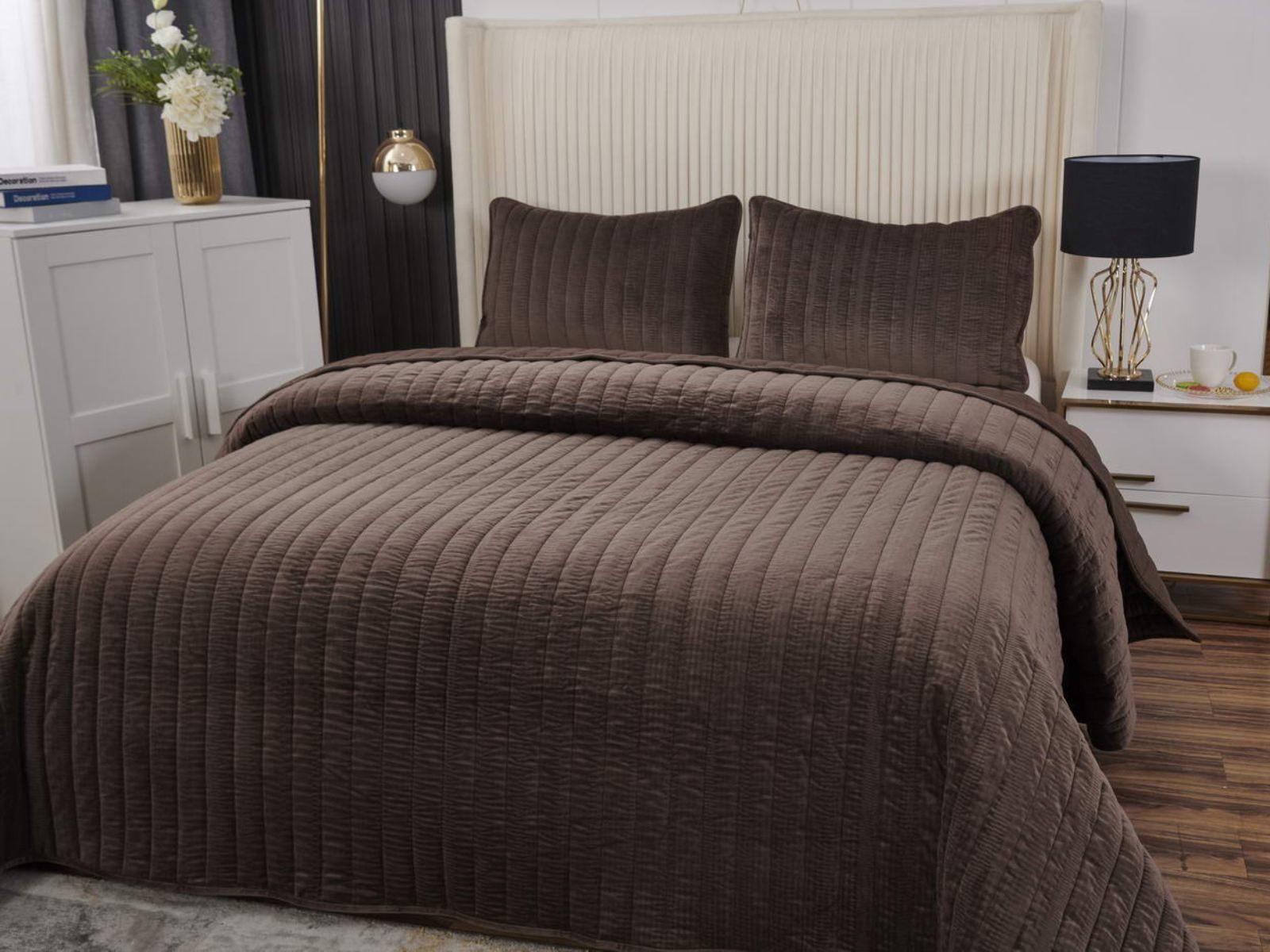 Величественный вид, мягкость материала, королевская роскошь – всё это идеально описывает новое покрывало Фердинанд. Оно выполнено из велюра на основе полиэстера и представлено в оттенках: чайная роза, молоко, бежевый, кофе, стоун, серый и мокко.