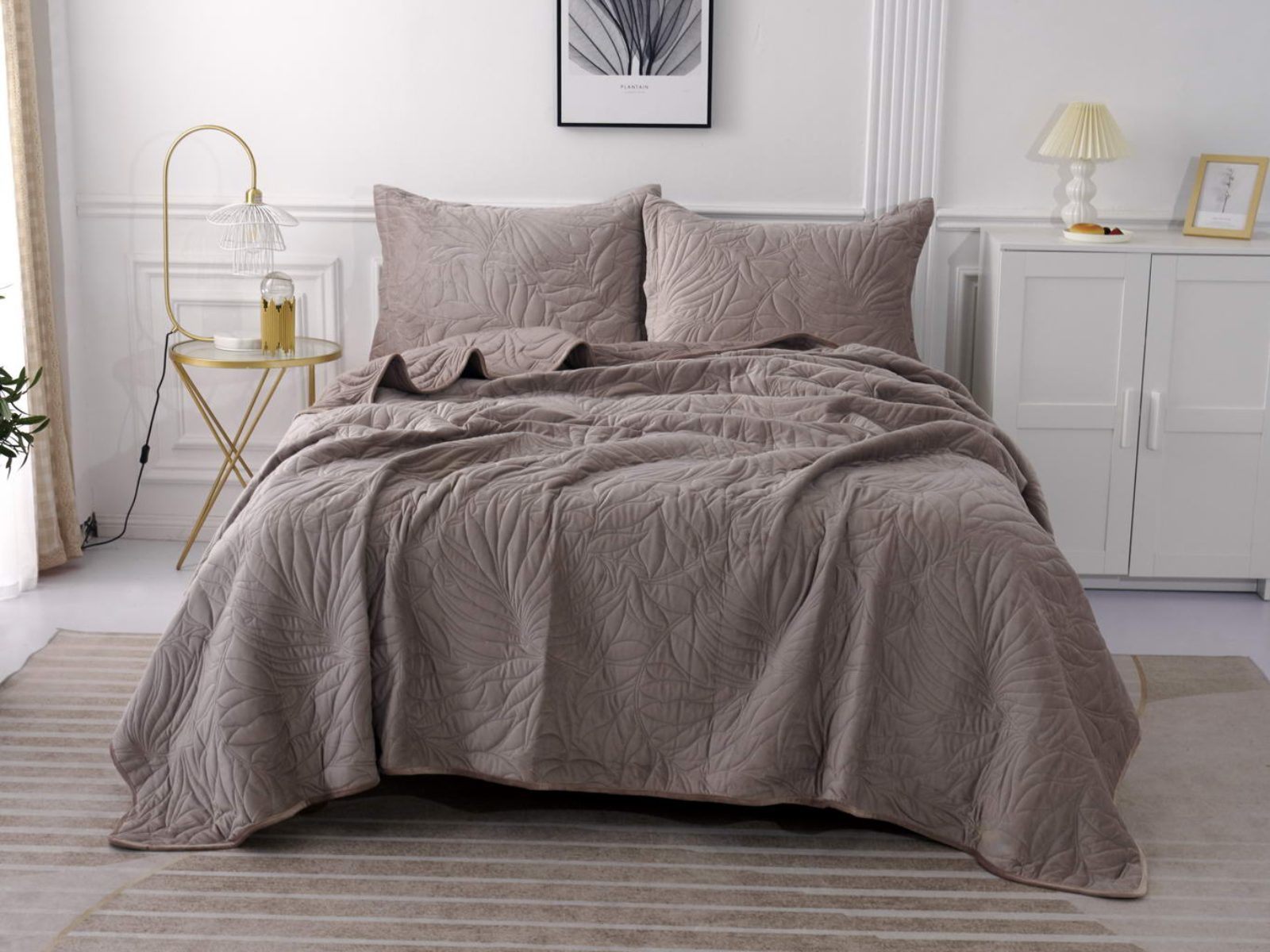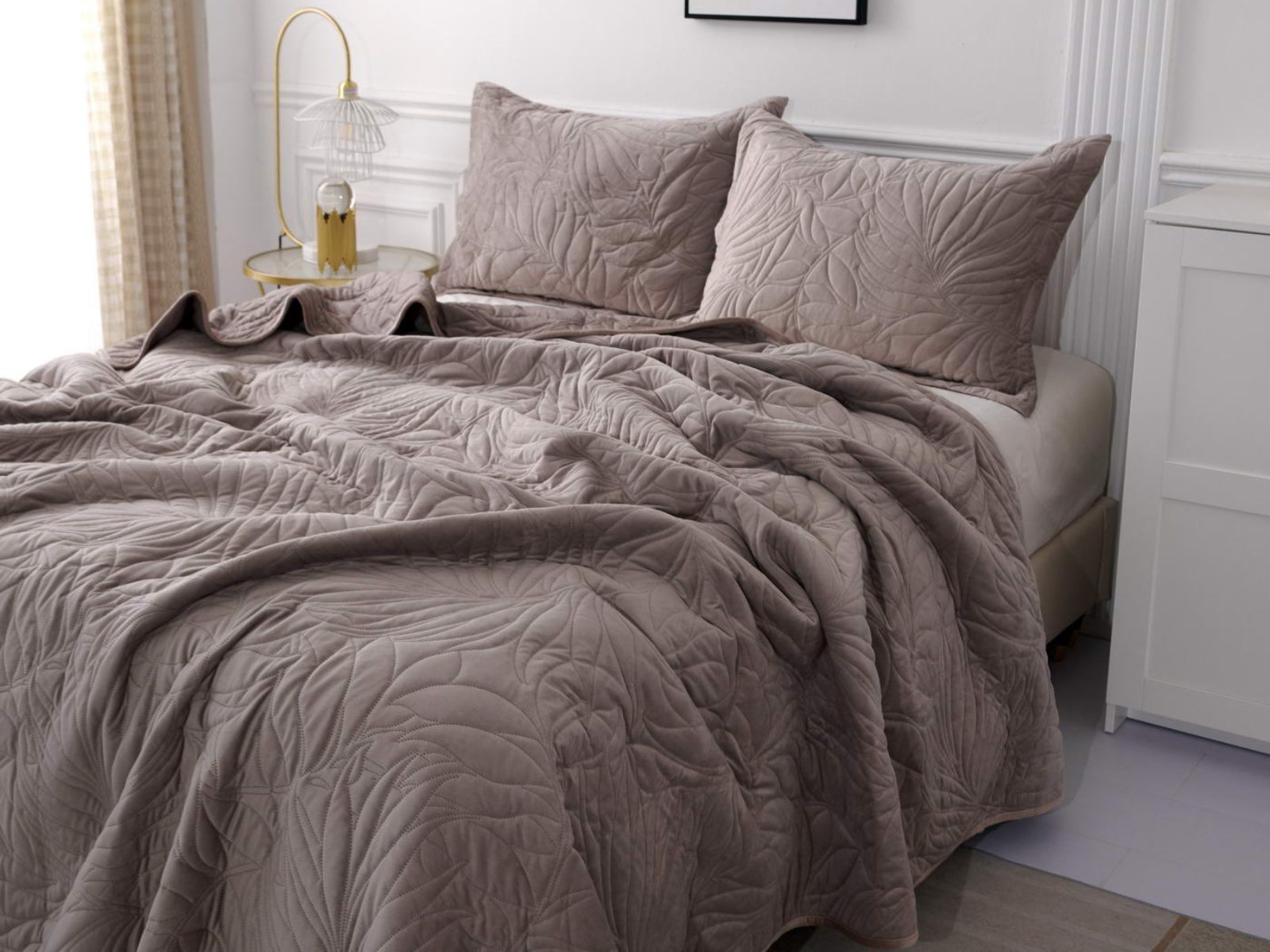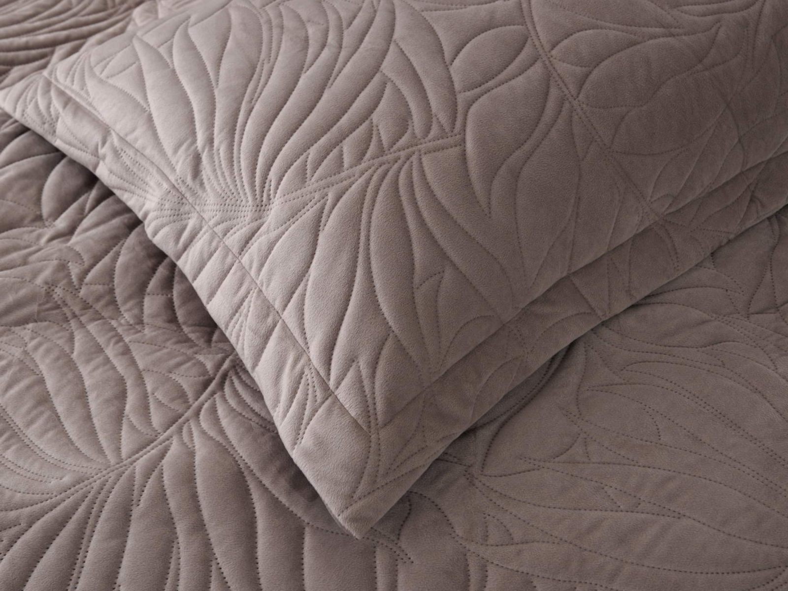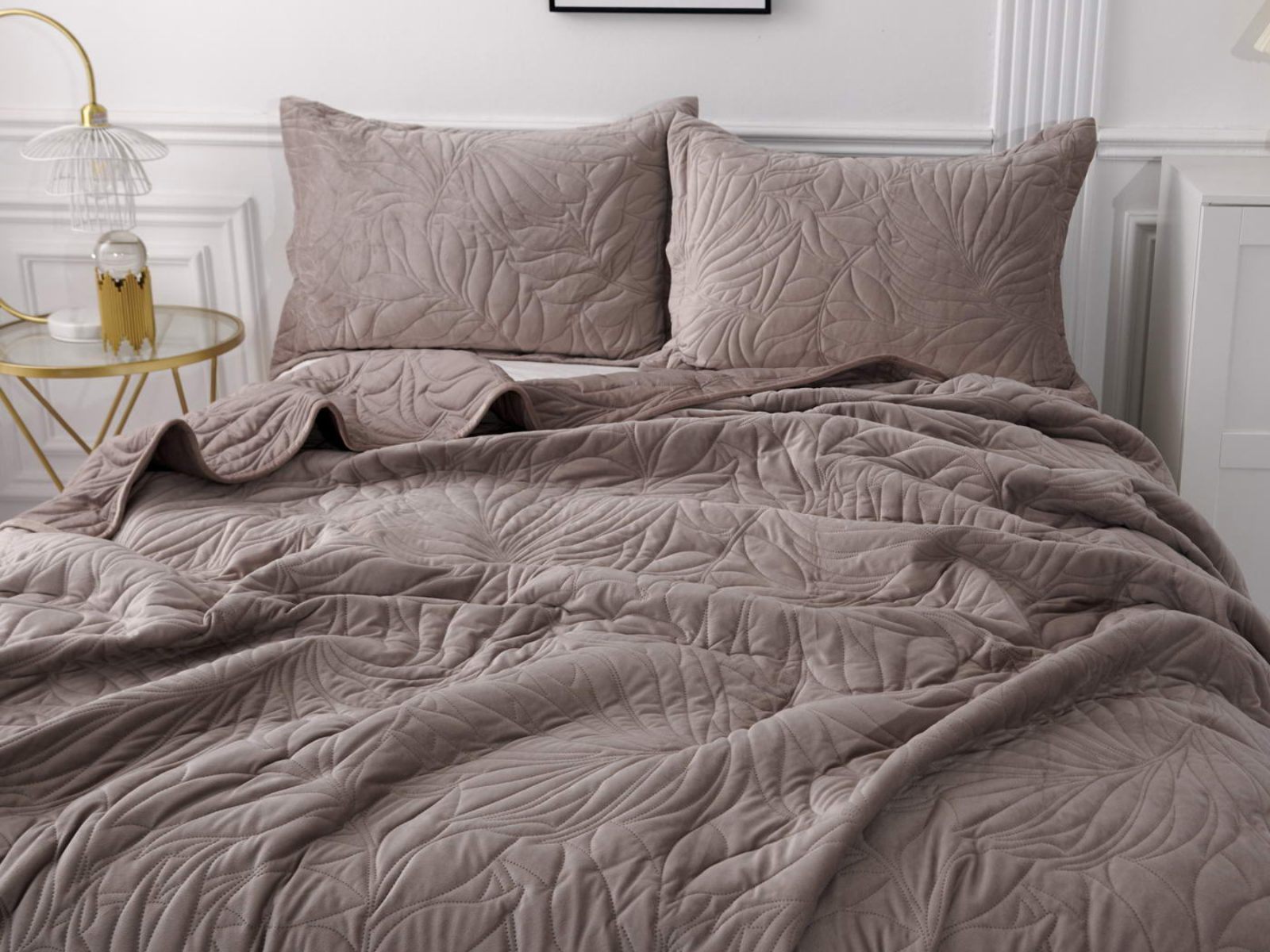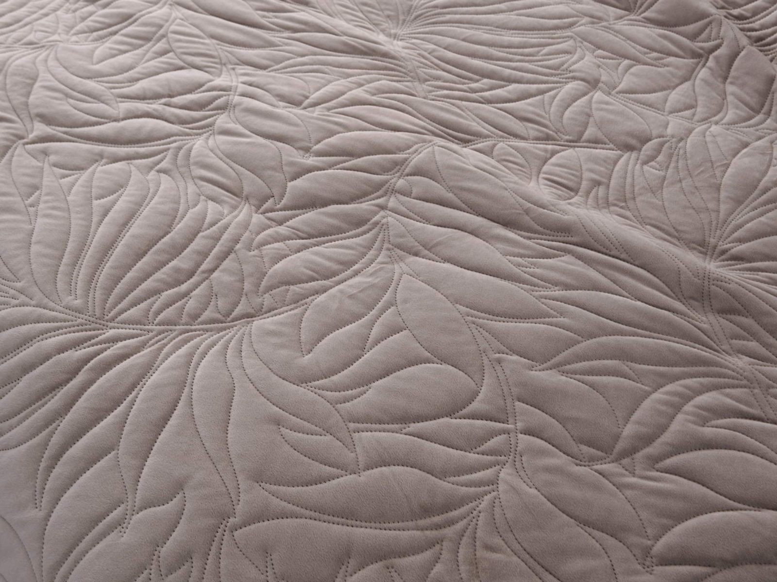 Стёганое покрывало Глория изготовлено из 100% вискозы, что делает его невероятно мягким и комфортным. Рисунок напоминает листья лавра. Такой орнамент подойдет большинству современных интерьеров.