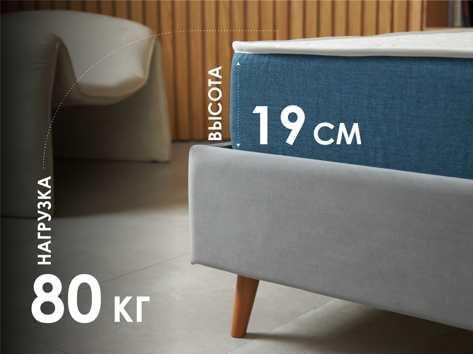 На матрас шьётся несъёмный жаккардовый чехол с содержанием хлопка. Для дополнительного комфорта спящего его простёгивают на ППУ. Бурлет изготавливается из прочной и красивой рогожки тёмно-синего оттенка.