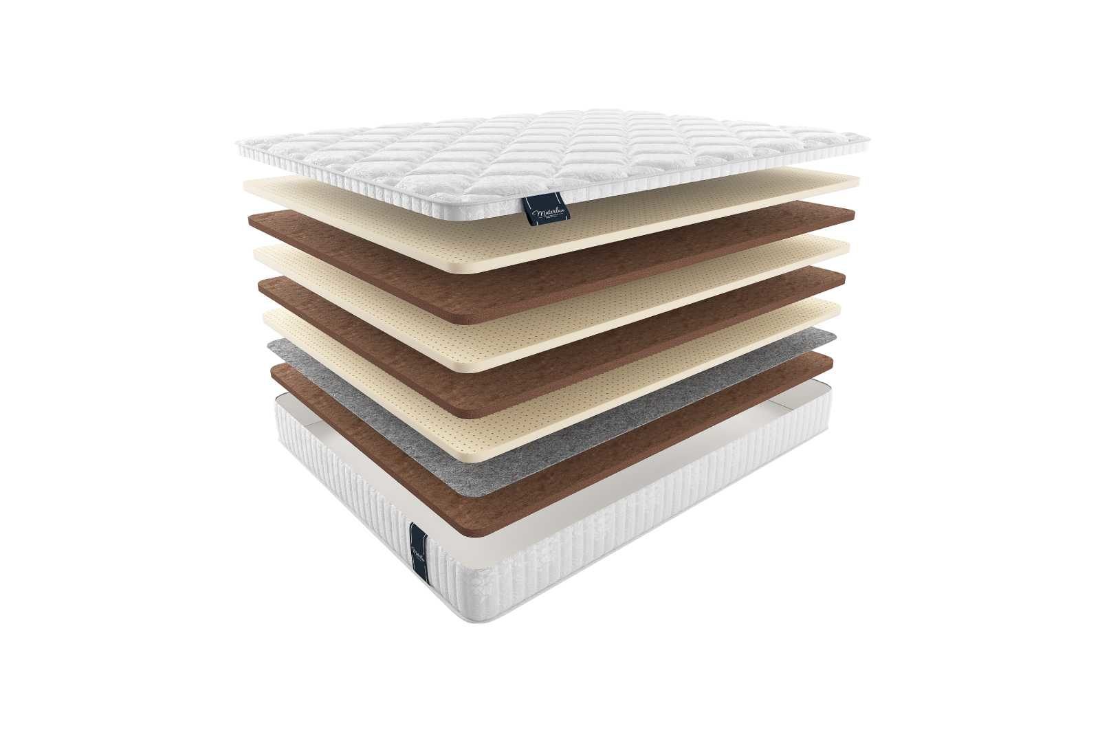 Если снять чехол, то перед нами предстанет шестислойный блок. Внешне это напоминает своеобразный сэндвич, состоящий из чередующихся слоёв натурального латекса и койры кокоса. Толщина каждой из плит составляет 3 см.