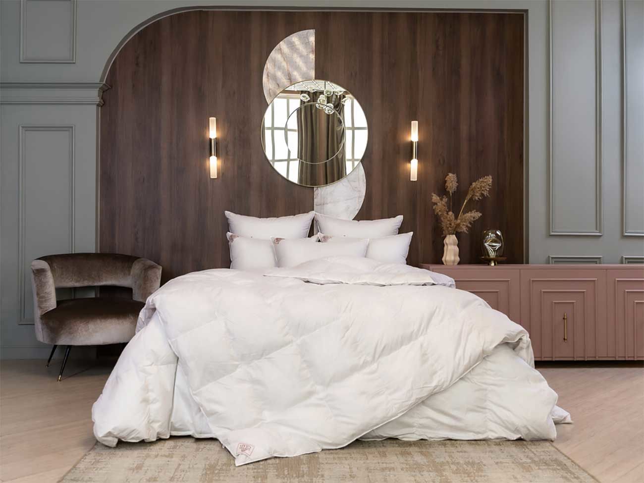 Изделия коллекция GRASS SILVER DOWN LINE наполнены серым пухом гусей Тулузской породы с добавлением мелкого перышка, что позволяет получить объемные подушки и пушистые одеяла. Чехлы выполнены из немецкой ткани, прошедшей финишную обработку SanProCare® Sensitive, которая позволяет материалу усиленно поглощать и отдавать влагу. Ткани сертифицированы по OEKO-TEX® Standard 100 – международному стандарту безопасности текстильных изделий. Ткани, отмеченные маркировкой «Bramscher Tuch» – это безусловный знак качества и великолепный результат работы специалистов из города Бра́мше в Германии. Высочайшей оценки требует буквально все: от высококачественного сырья и тончайшей пряжи до заключительной эксклюзивной отделки тканей. Сочетание тонкой ткани и серого пуха придают изделиям серебристый оттенок, что легло в основу названия коллекции.