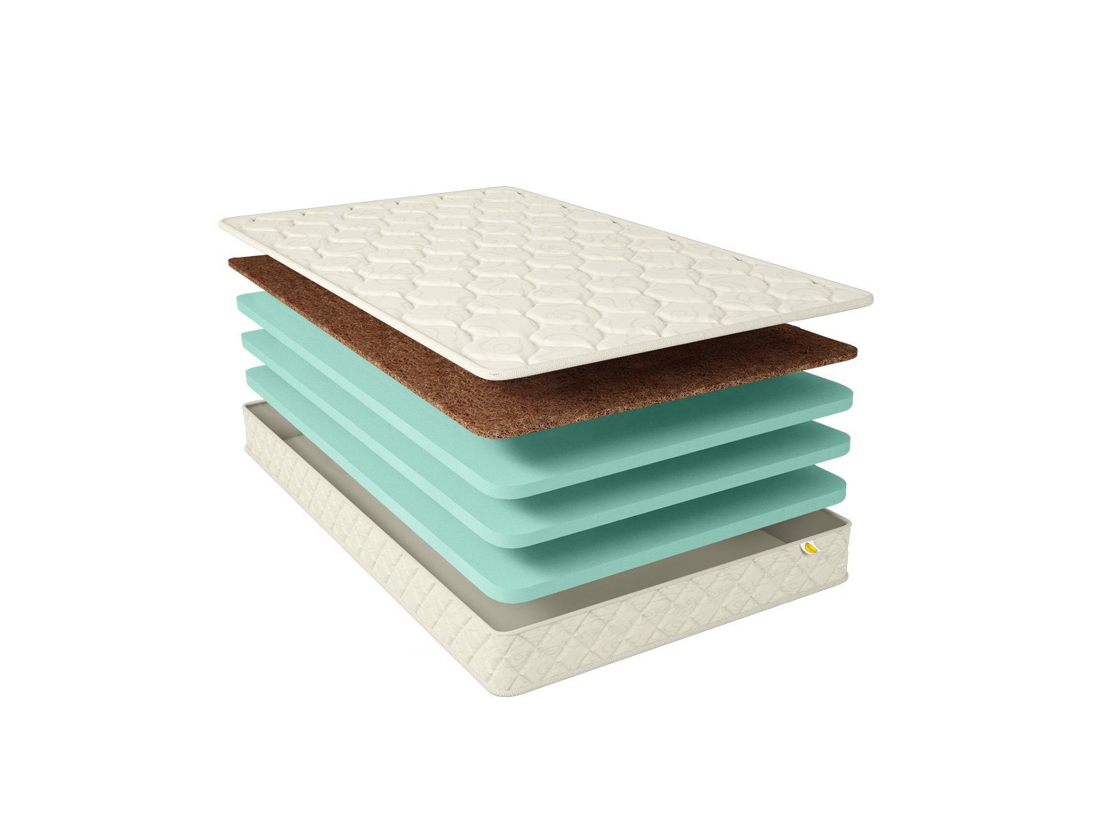 Внутреннее наполнение матраса представлено такими материалами как природная кокосовая койра и блок искусственного латекса. Вместе они дают высоту модели равную 10 см и легко выдерживают нагрузку до 100 кг на спальное место.