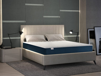 Матрас получил стильный двуцветный чехол с контрастным синим бурлетом. Спальные поверхности оформлены при помощи светлого трикотажа кремового оттенка. Для ещё большего комфорта и мягкости ткань простёгивается по слою синтепона.