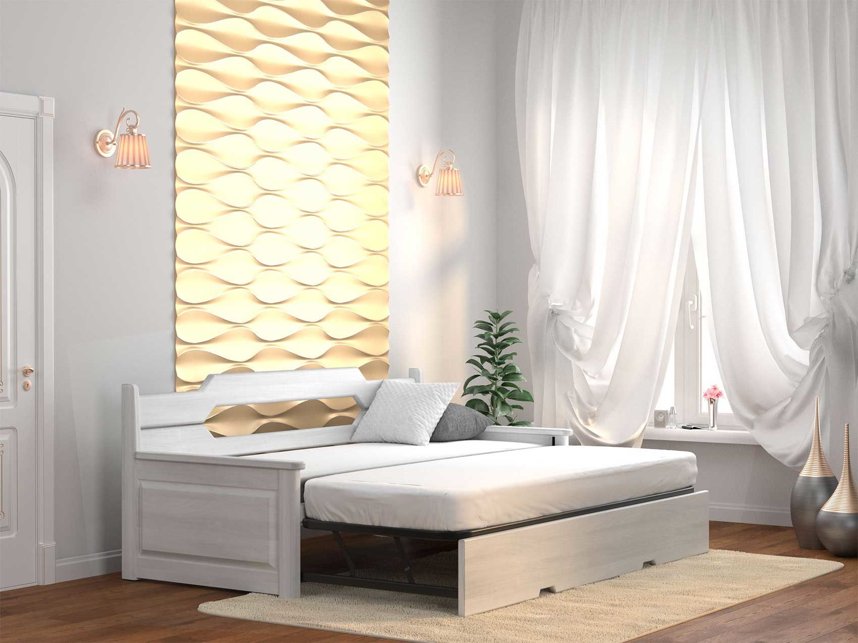Воплощение практичности и надежности спального места. Модель выполнена из 100% массива благородных пород древесины и легко трансформируется из односпальной кровати в двухспальную кровать с полноценными ортопедическими матрасами высотой до 14 см. каждый. Размер одного спального места (в сложенном состоянии) – 80 см. в ширину и 200 см. в длину, а размер второго (шагающая часть) - 73 см. в ширину и 190 см. в длину. Высота боковых поручней - 58,5 см. Высота задней спинки 87 см. Высота "изножья" с лицевой стороны - 37 см. Внешние габариты: 10 см. к длине и 14 см. к ширине. В разложенном состоянии габариты кровати составляют 160 см. в ширину и 212 см. в длину. Требуется сборка.