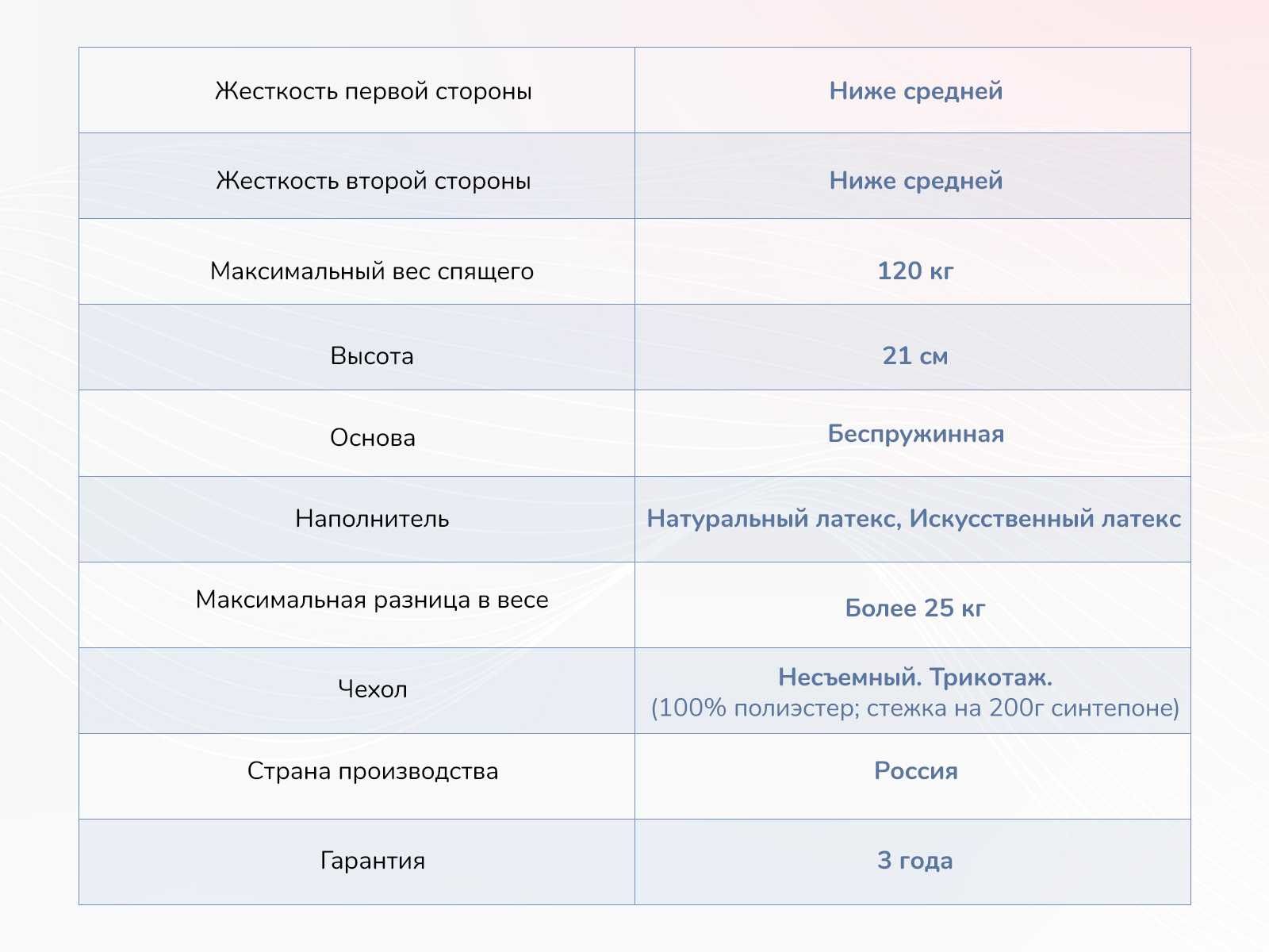 Модель сочетает в себе природный комфорт латекса, правильную поддержку ортопедической пены и практичный формат рулонной поставки, обеспечивая мягкое и комфортное спальное место.