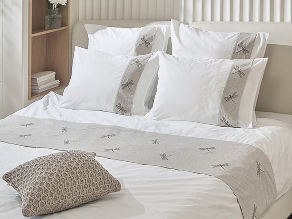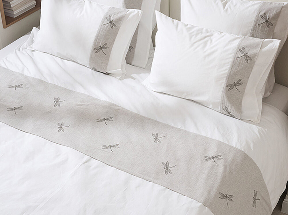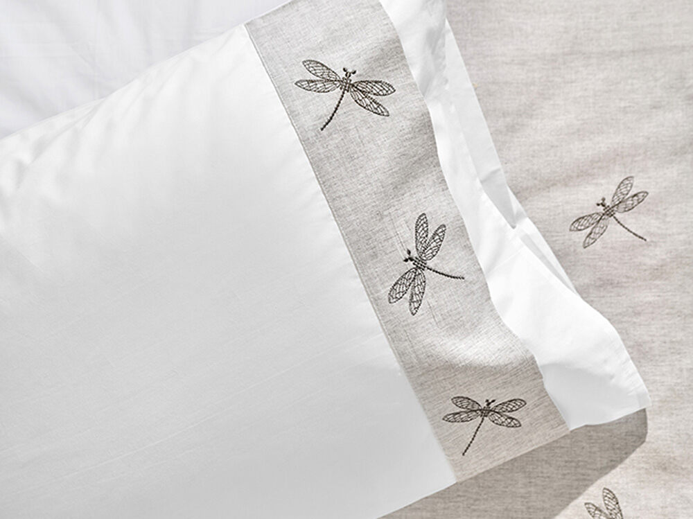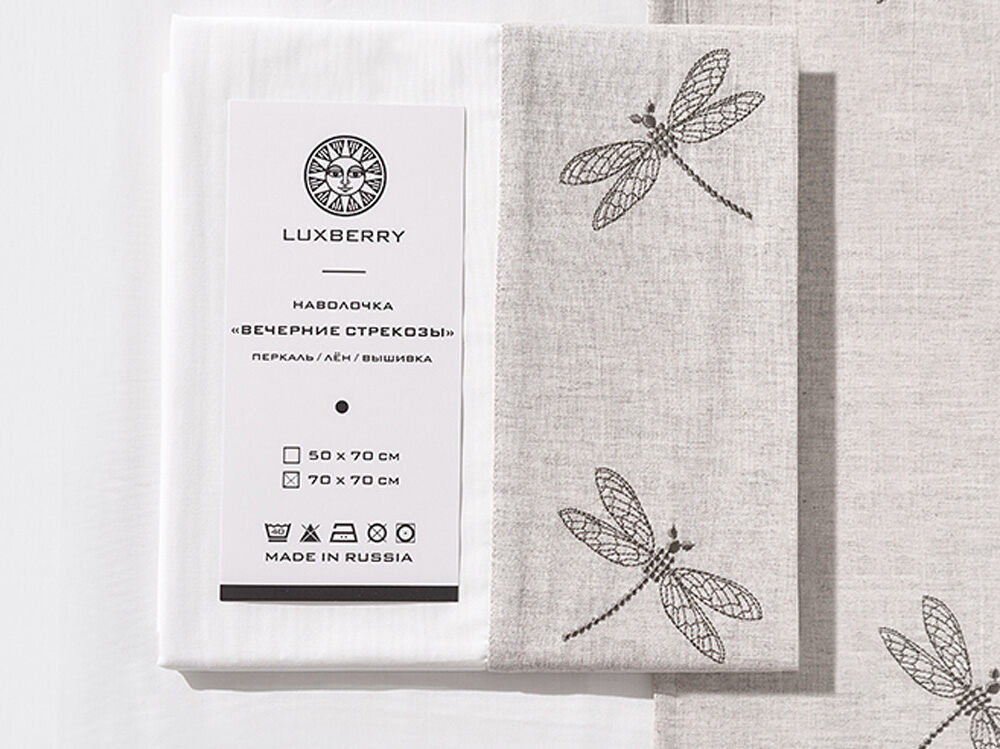 Наволочка Вечерние стрекозы сшита из белоснежной высокопрочной перкали плотностью 200ТС, полоса виде отделки - это лен, на нем тонкая вышивка - парящие стрекозки!
