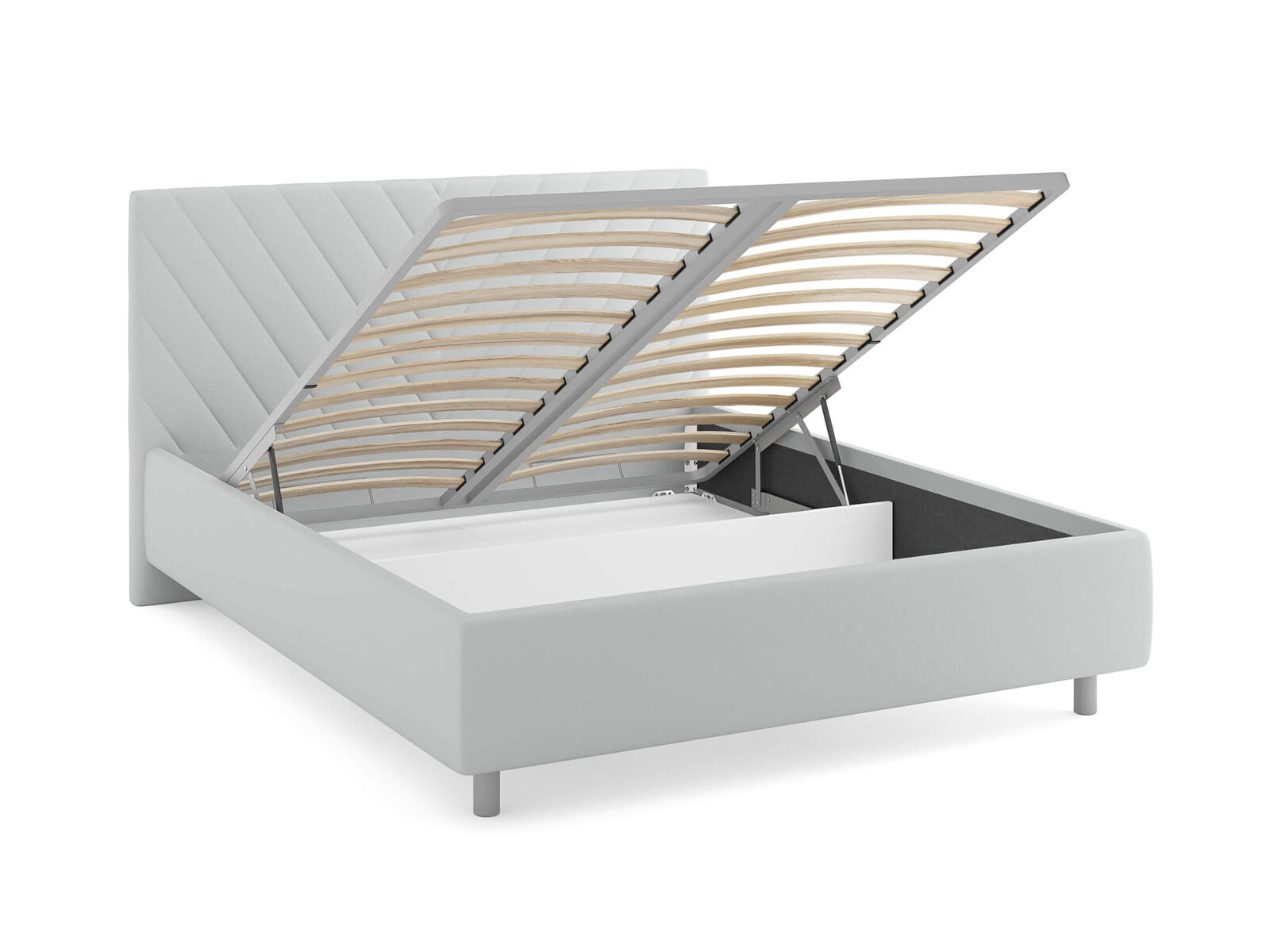 Кровать комплектуется металлическим основанием и подъемным механизмом со вместительным бельевым ящиком. Дно бельевого ящика легко сдвигается для обеспечения уборки под кроватью.